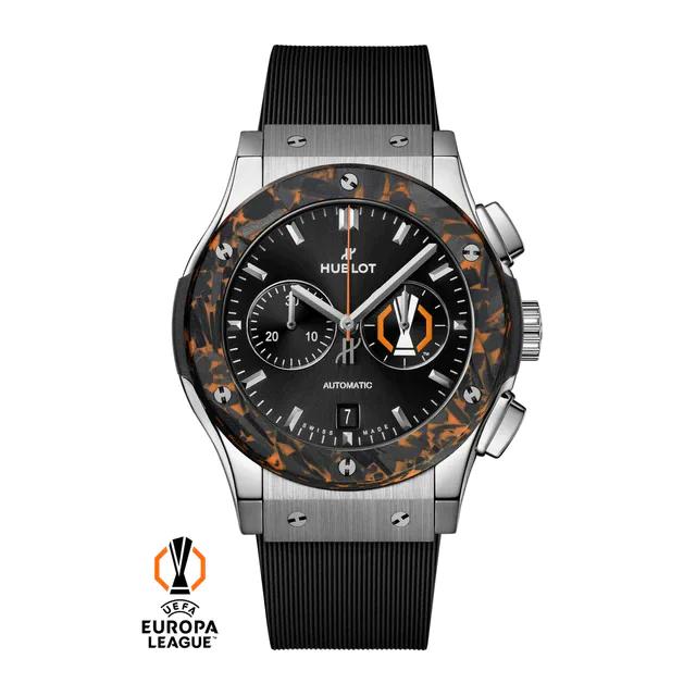 ウブロ 新作「クラシック・フュージョン クロノグラフ UEFA ヨーロッパリーグ チタニウム カーボン」ブラックとオレンジが彩る50本限定モデル