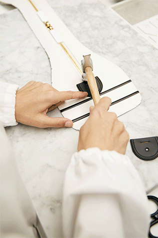 このマストハブな「ディオール ヴァイブ」には、 デザインから製造まで象徴的なカーブが軽やかに、 そして精巧に落とし込まれています。 「CHRISTIAN DIOR」のシグネチャーであるストライプは、 レザーと発泡フォームのレイヤーで構成され、 高周波プリントで型押しされました。 木型を使って切り出されたパーツは、 ひとつひとつ手作業で組み立てられて縫合されます。 ディオールのラッキースターがあしらわれたラバーの底面は、 スニーカーのソールからインスピレーションを受け、 底鋲がほどこされ、 カジュアルな雰囲気とアーティスティックなディテールが見事に融合しています。