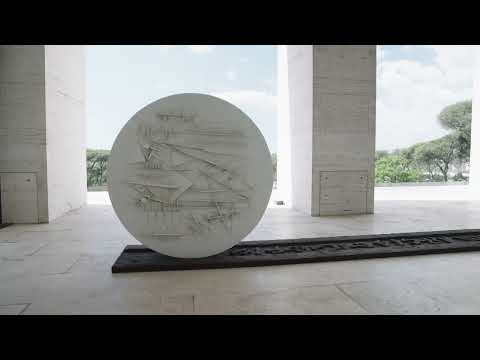 まるでこの二つの部屋を繋ぐように、「Rotativa di Babilonia」(1991)は「イタリア文明宮」の窓から見える屋外に置かれ、その円形の形は、時間と空間の中で起こる循環的で連続した運動のアイデアを暗示しています。廊下の内側には、21枚の白色、黒色、さび色のチョーク画のようなレリーフで構成される「Tracce」シリーズ(1998)が展示されています。