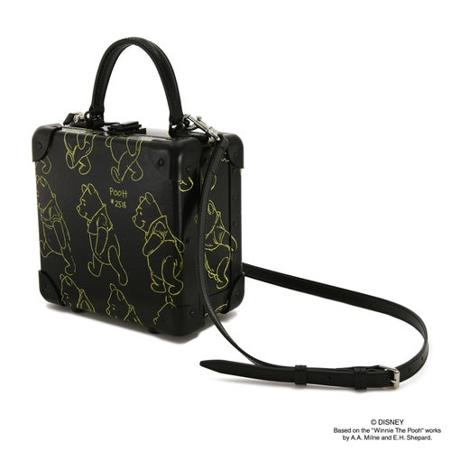 ストレージボックス ライニング ボディ・レザーハンドル・メタルパーツをブラックで統一し、プーさんのキャラクターをモノグラムプリントで表現したシリーズはクールなベースカラーとプーさんの全面プリントにより、インパクトと可愛さを共存させながら、内装もブラックのトーンで統一しモダンかつシックな印象を与えます。