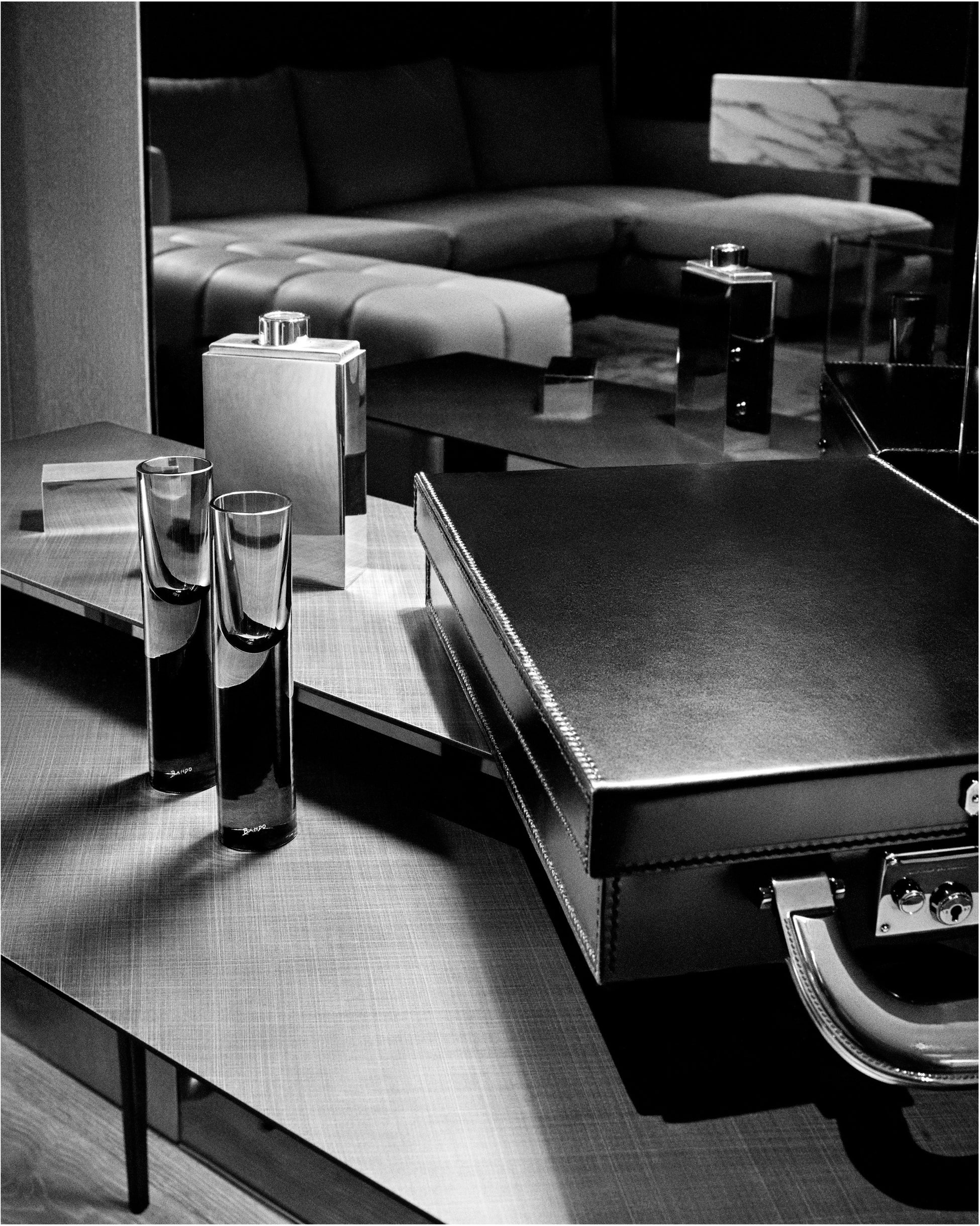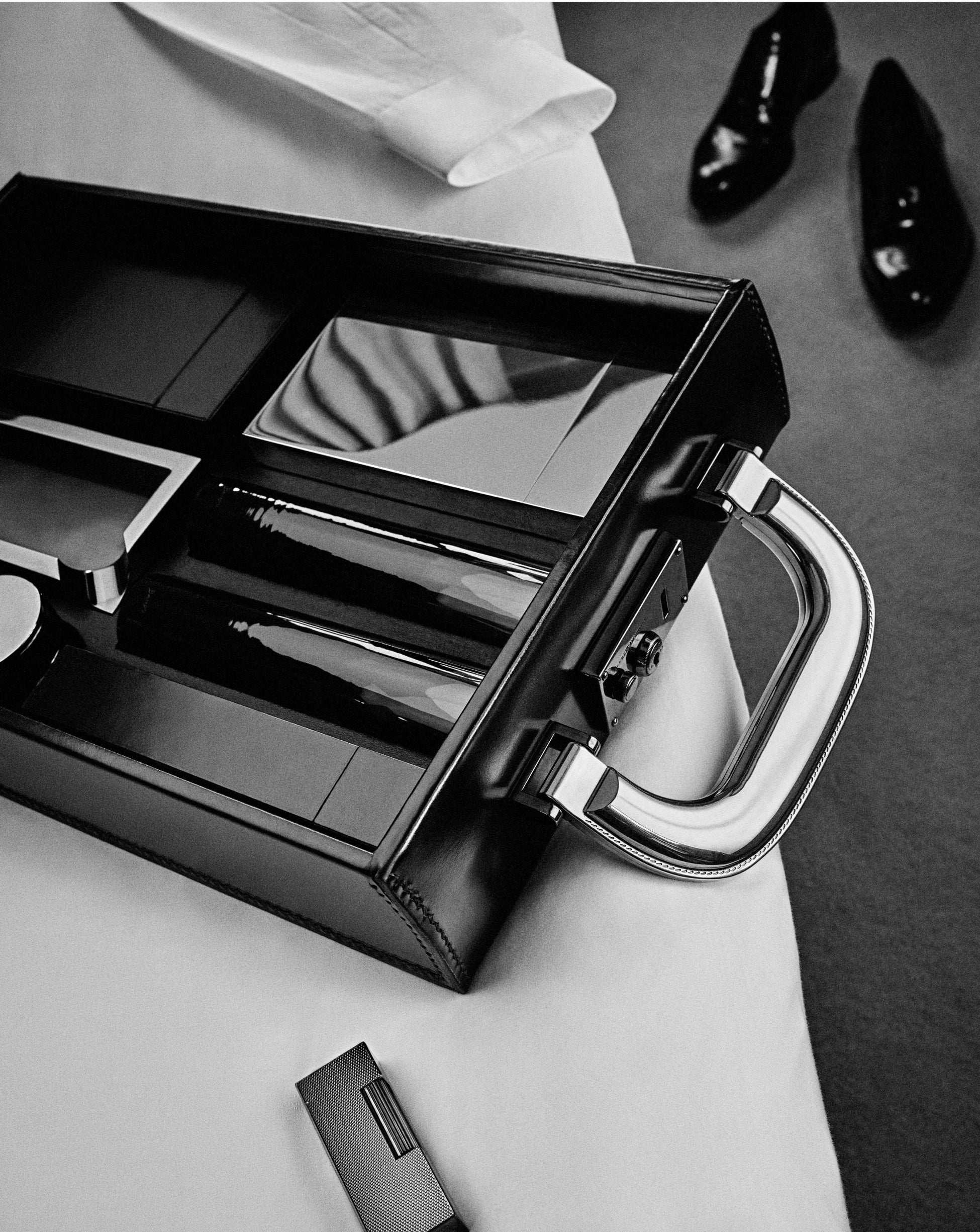 ダンヒルの130年の歴史と馬具製造の起源に敬意を表した特別なアタッシュケースは、英国製ブライドルレザーを使用して手作りされました。中にはガルバナイズドブラックのアイコニックなローラガスライターから、スターリングシルバーコーティングのフラスク、スモークグレーのミネラルガラス製のハンドメイドショットグラスまで、誰もが羨む極上のアイテムが隠されています。享楽的な喜びが、英国の格式を象徴するシンボルの中に控えめに宿っています。