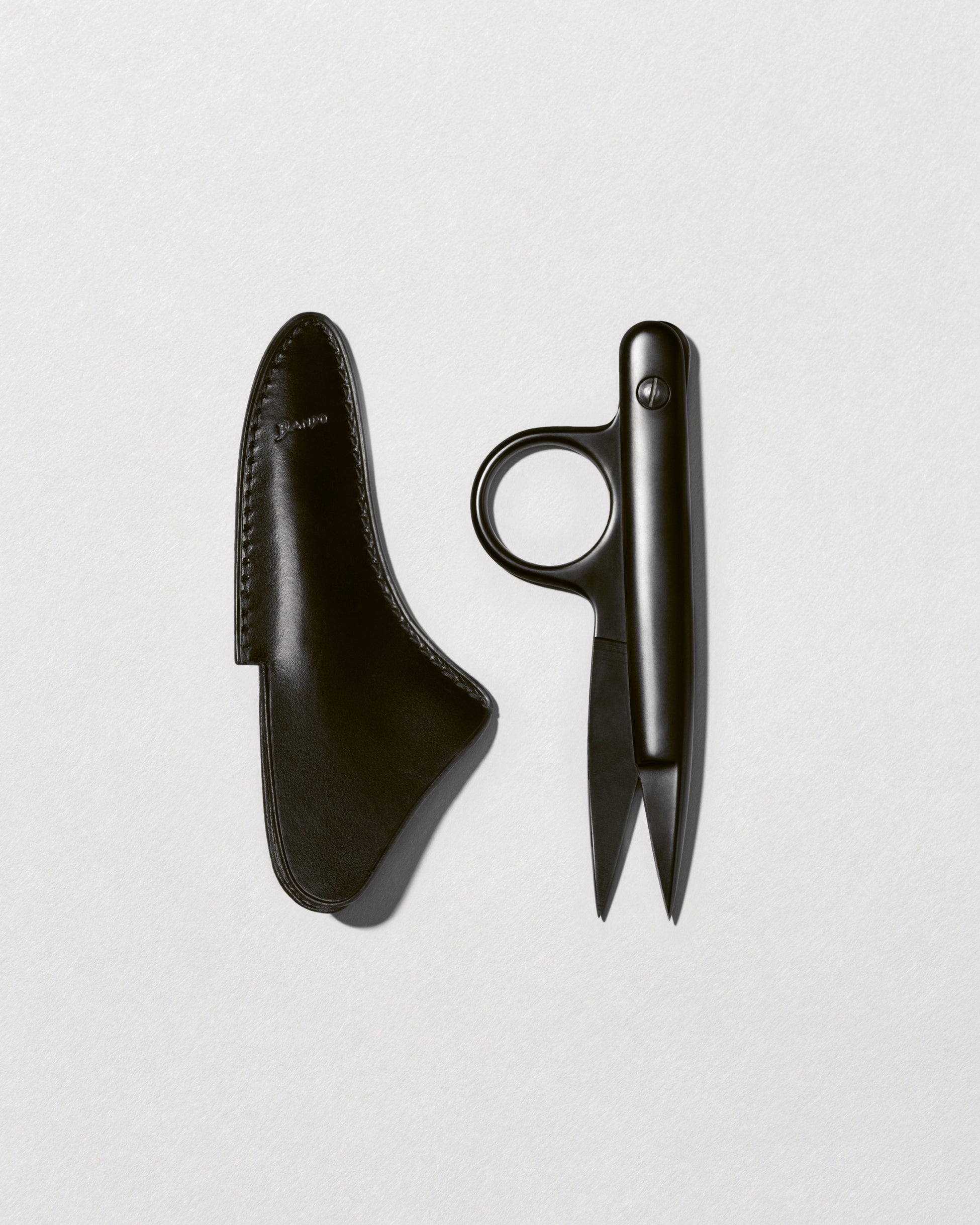 シザー&スリーブ エレガントなスチール製のシザーと、滑らかなブラックブライドルレザーのスリーブ。マッテオ・チェッリーニに敬意を表して、特徴的な「Bando」マークがエンボス加工されています。