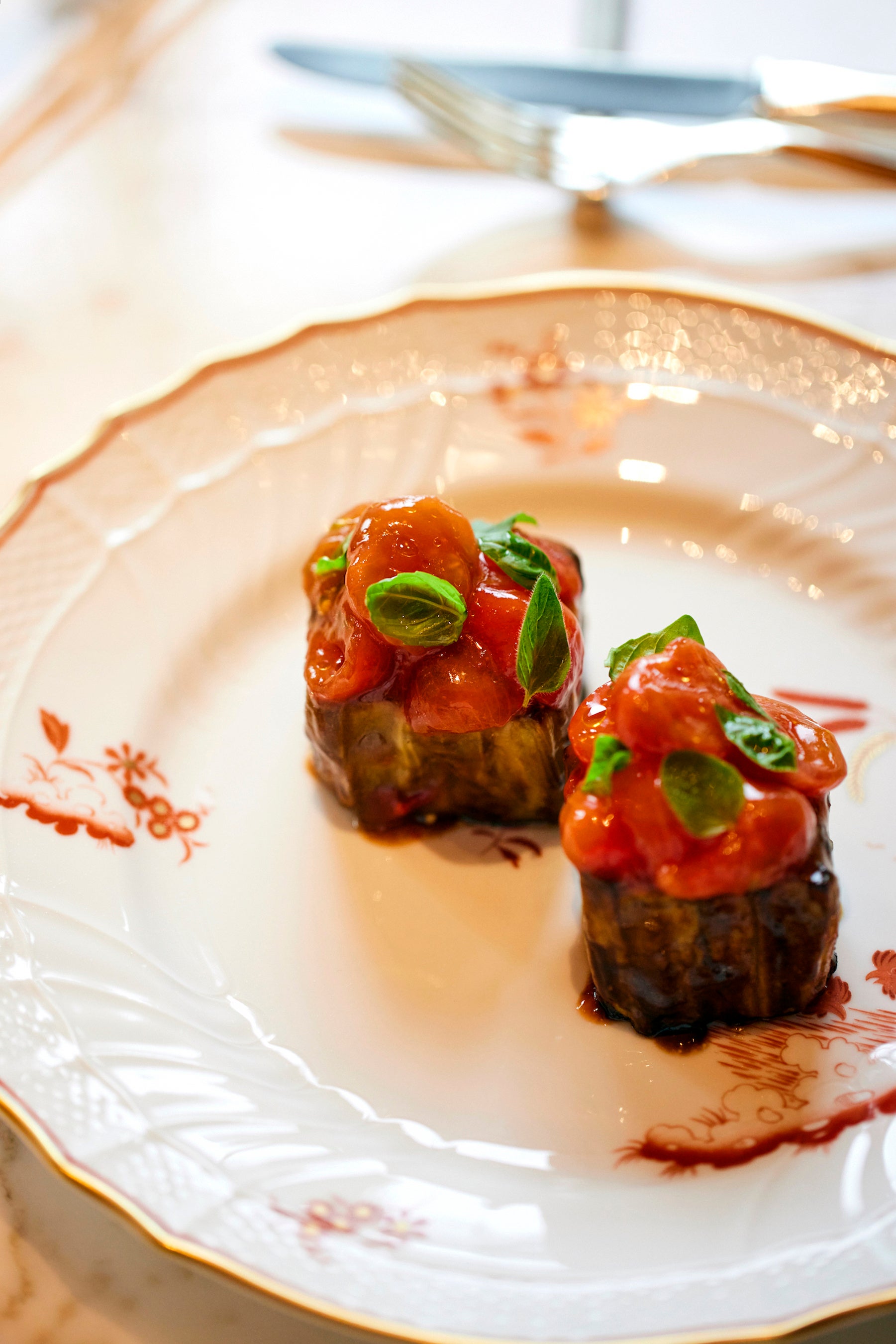 革新的なアプローチによって進化する、イタリア料理の伝統を巡る旅 イタリアの夏の味覚を集めた、シェフの代表的な前菜の一つ「茄子のグラッセ トマト バジル ケッパー オリーブ」は、オーブンで焼いた後に茄子のグレーズを塗り、さらにオーブンでの加熱を繰り返して作ります。その複雑な調理工程と、茄子のスライスの厚みやその食感が、この野菜の全く新しい一面を体験させてくれます。