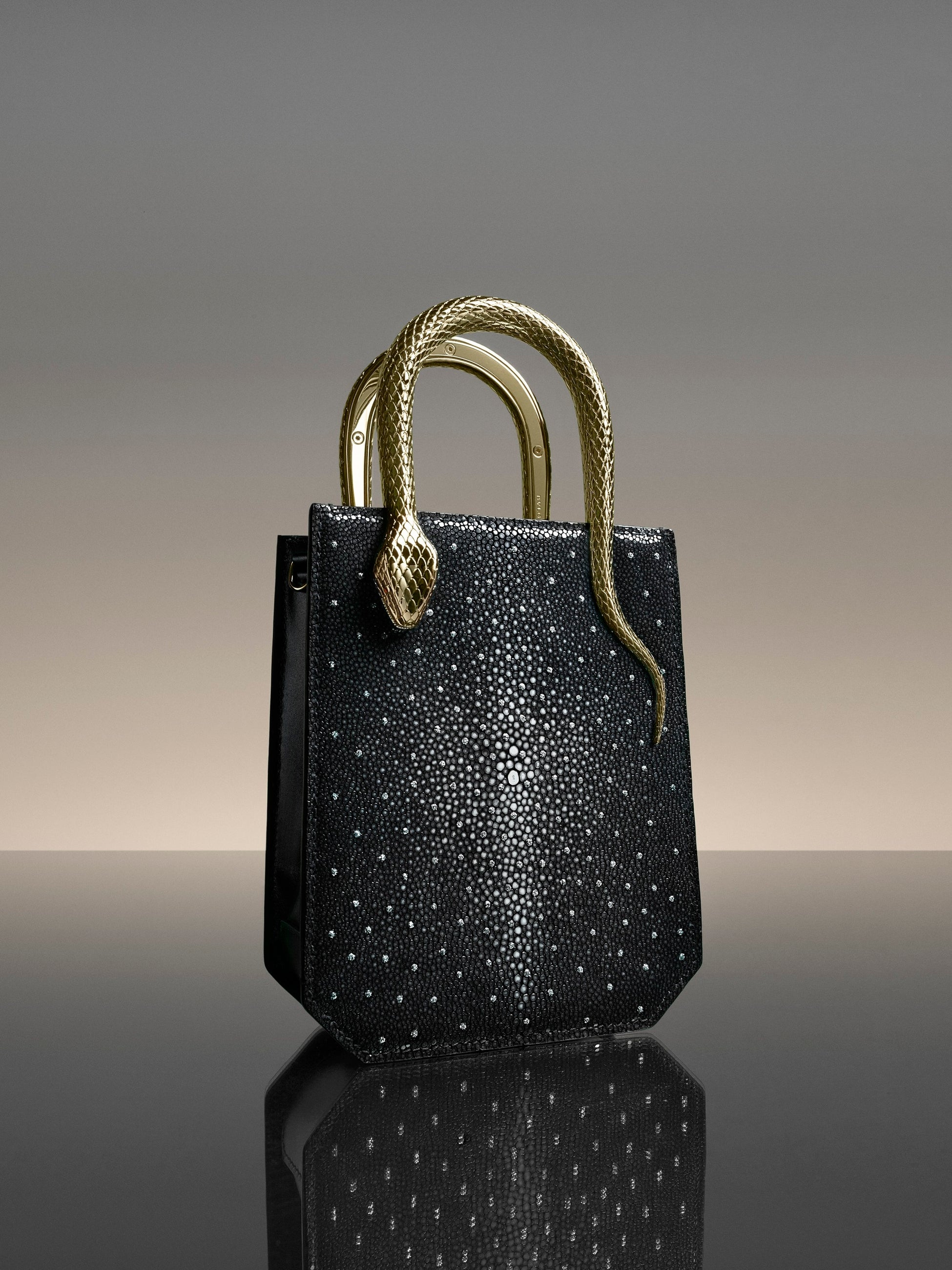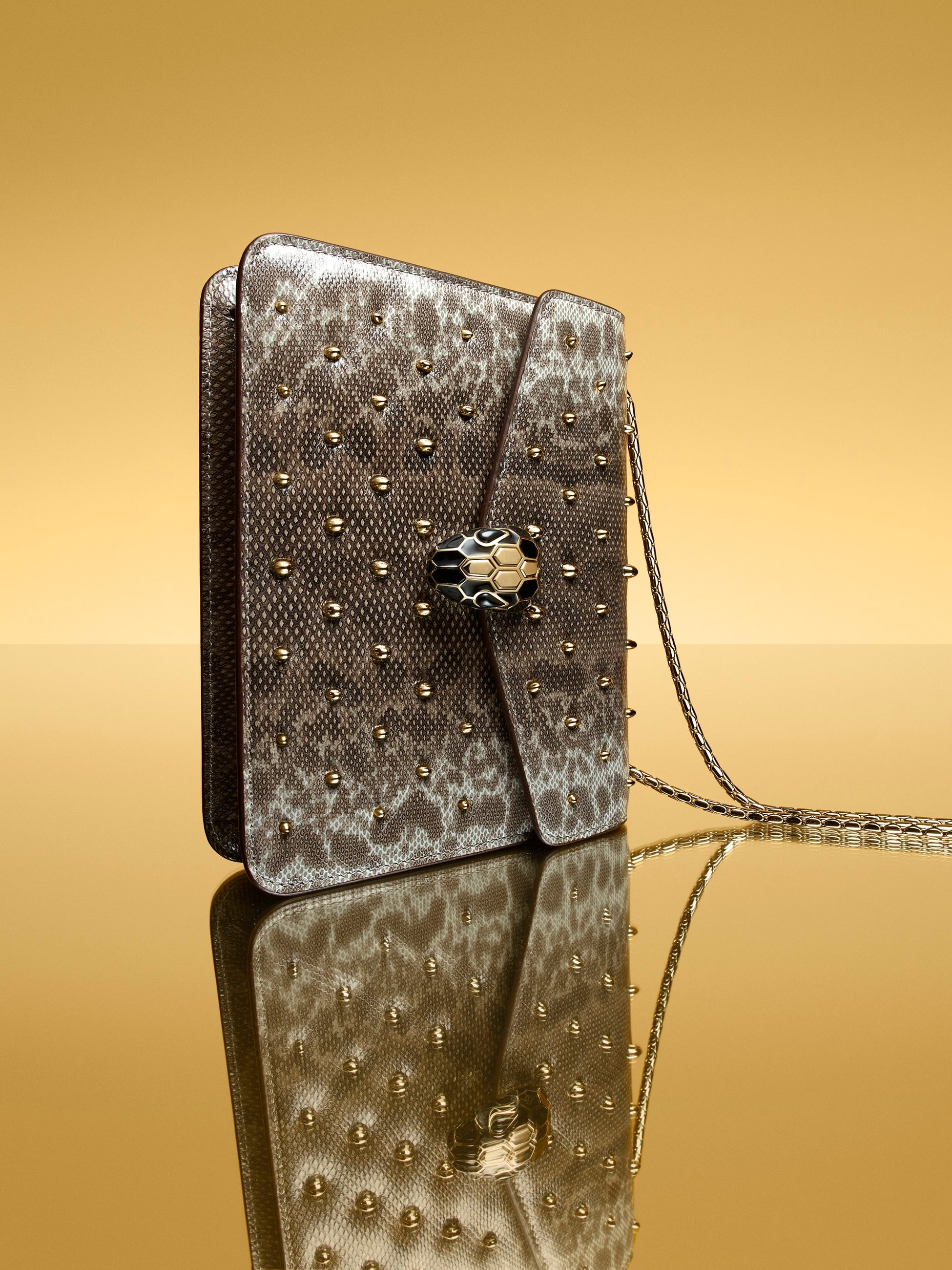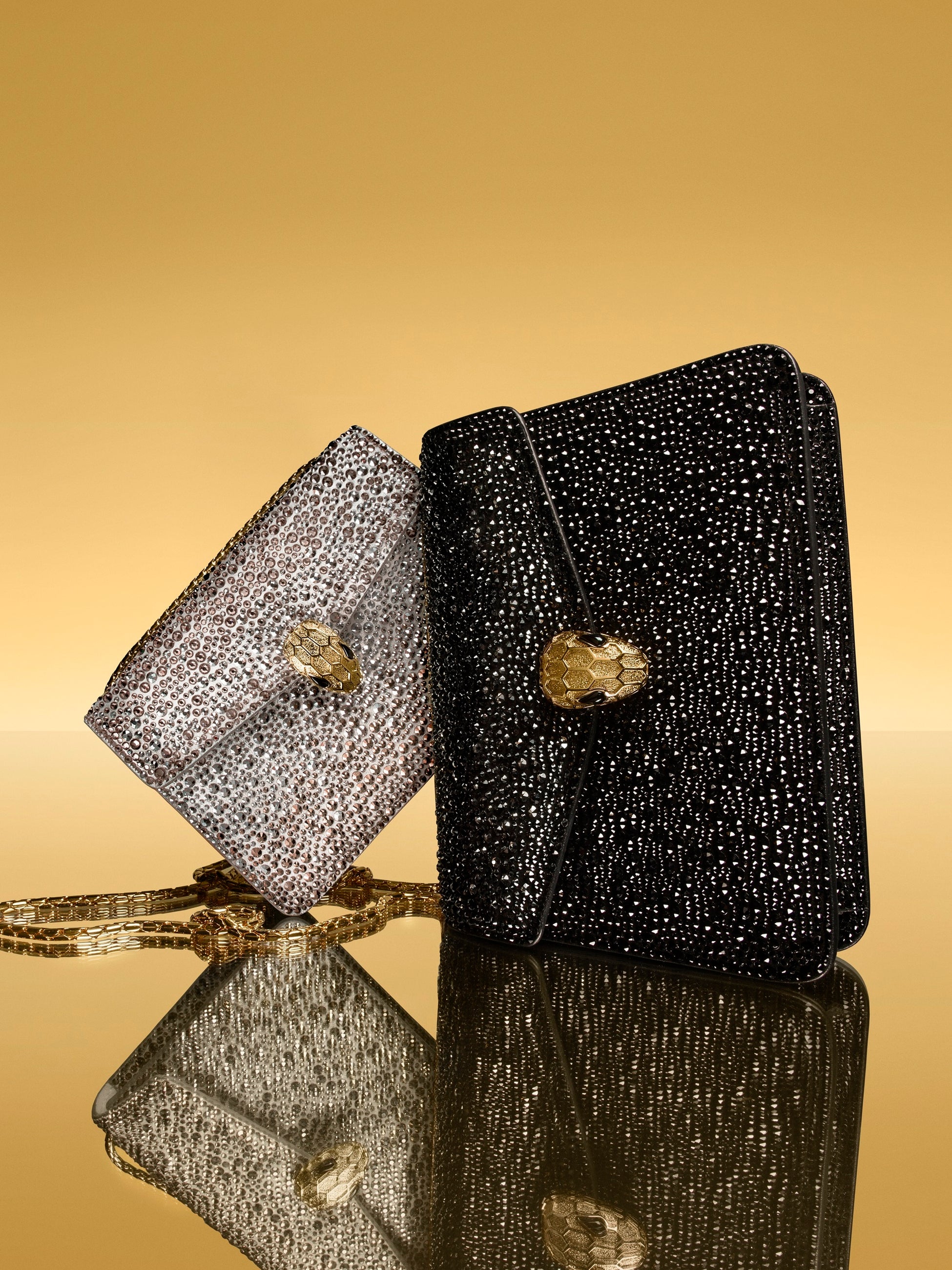 クリスタルの滝を浴び、プレシャス感たっぷりに燦然と煌めくクラフツマンシップの傑作が登場します。このバッグでは、ブルガリのプレシャスな宝石の魅惑的な輝きを、約11,000個もの様々な大きさのクリスタルで豪華な煌めきを再現しています。そのスネークヘッド クロージャーは、ダイヤモンドカット調にリニューアルされ、メタルにスノーセッティングパヴェのように光揺らめく細かな凹凸のある表面加工を施された仕様になっています。一方、ガルーシャに敷き詰めた細かなダイヤモンドの粒が光り輝くバッグや滑らかでセンシュアルなカボションカットからインスピレーションをうけた形のメタルスタッドが、煌めくカルングスキンの上に光の雨のように降り注がれる光沢感のあるバッグなど珍重される素材とラグジュアリーを極めたクラフツマンシップが融合した逸品も展開されます。さらに、ゴールド箔があしらわれたメタリック仕上げが優美なオーストリッチ素材のバッグも新たに登場します。
