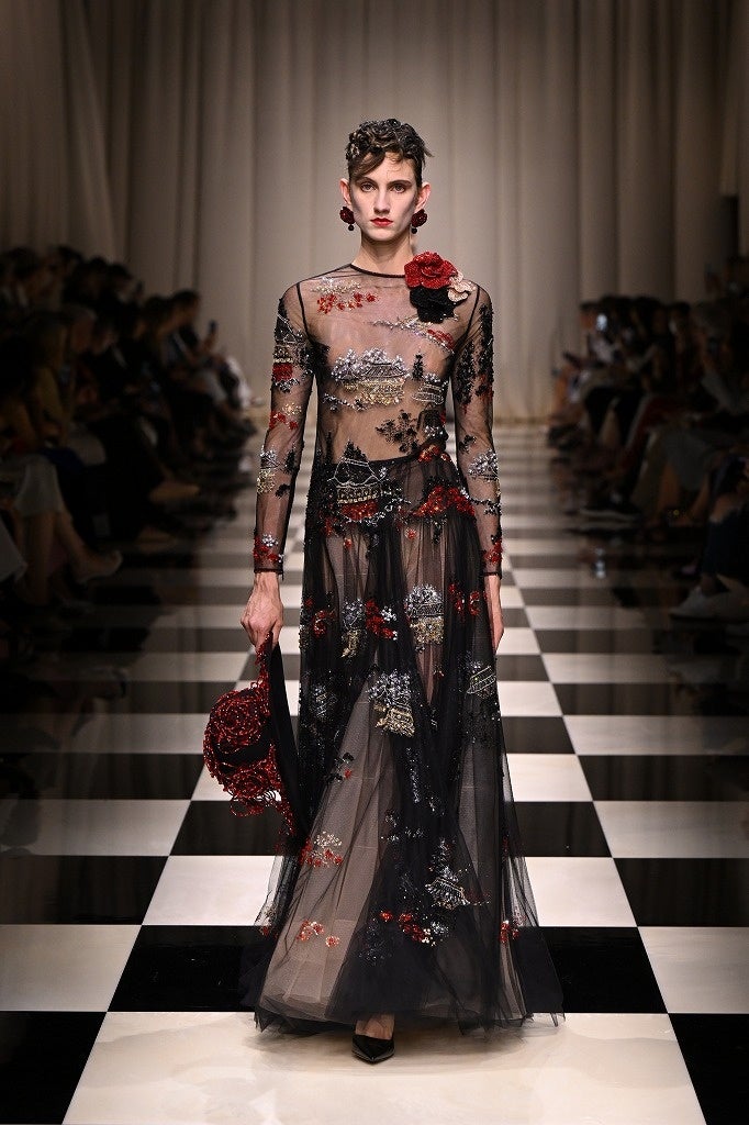 女性が持つイマジネーションやクチュールの世界と密接に結びついた薔薇の花が、デザイナー自身の感性と緻密な視点によって描かれました。 ラインはシャープでありながらしなやか。コンパクトなジャケット、ロングスカート、落ち感のあるパンツ、ドレスがシルエットを象り、足元には揺るぎない自信を象徴する細く高いヒール。リズミカルでジオメトリックなパターン、眩い光の装飾、異国の文化が融合し描き出された薔薇のモチーフが、魅惑的な女性を表現しています。