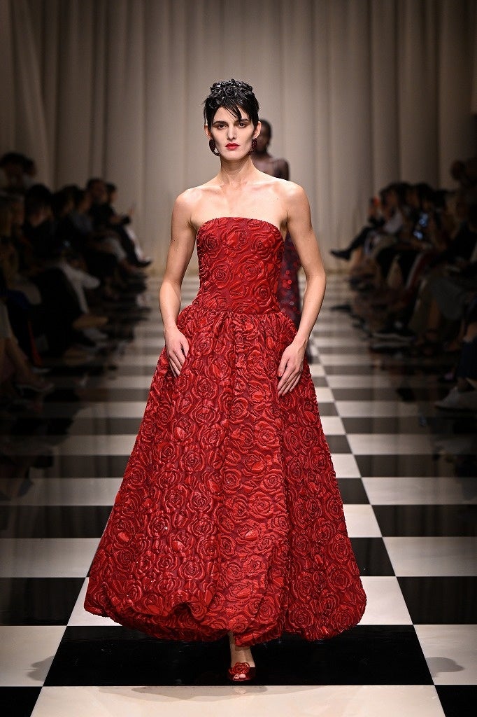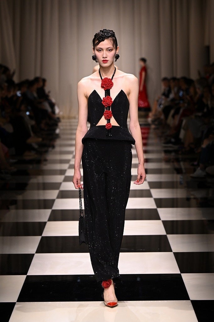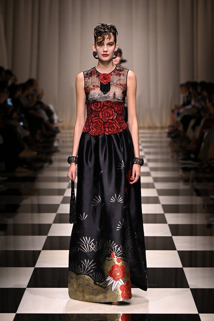 華やぐ薔薇のとき 魅惑的でミステリアスな深紅の薔薇。ブラックやゴールドの煌めくアクセントで美しく彩られた、艶やかな薔薇が咲き誇ります。ヨーロッパからアジアへの軌跡が細長いシルエットを通して描かれ、ロマンティシズムの象徴ともいえる薔薇を新しいアプローチで再解釈していきます。
