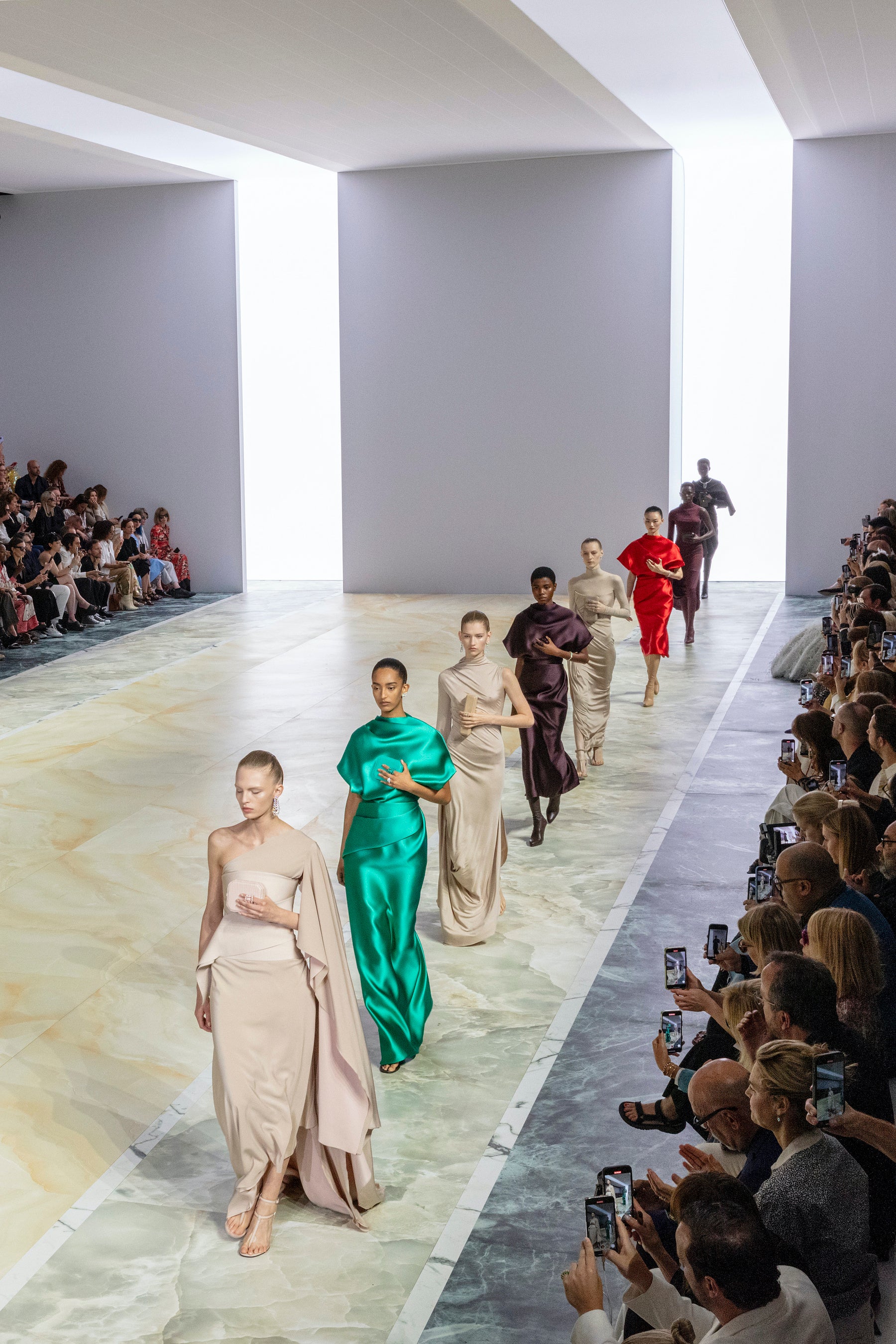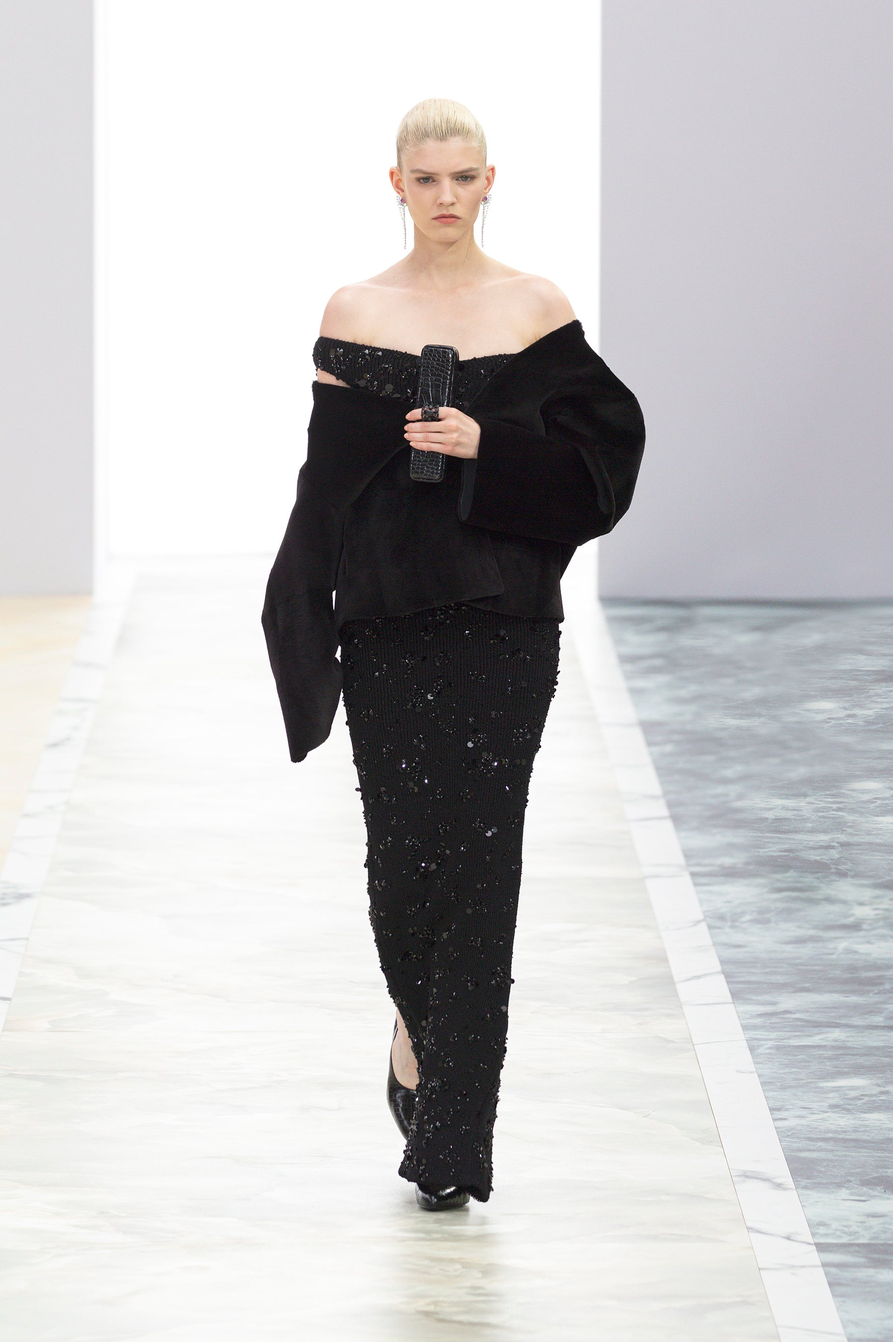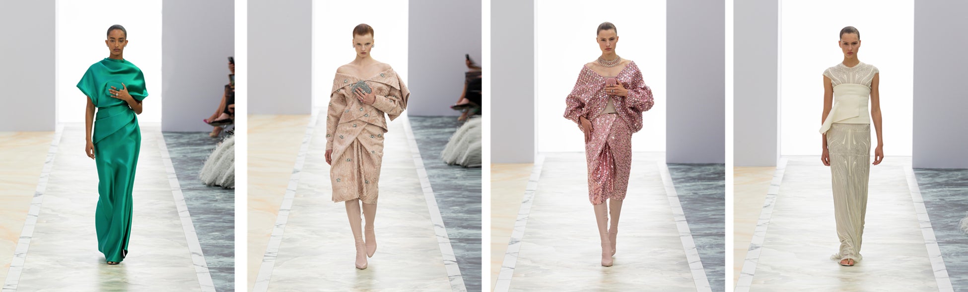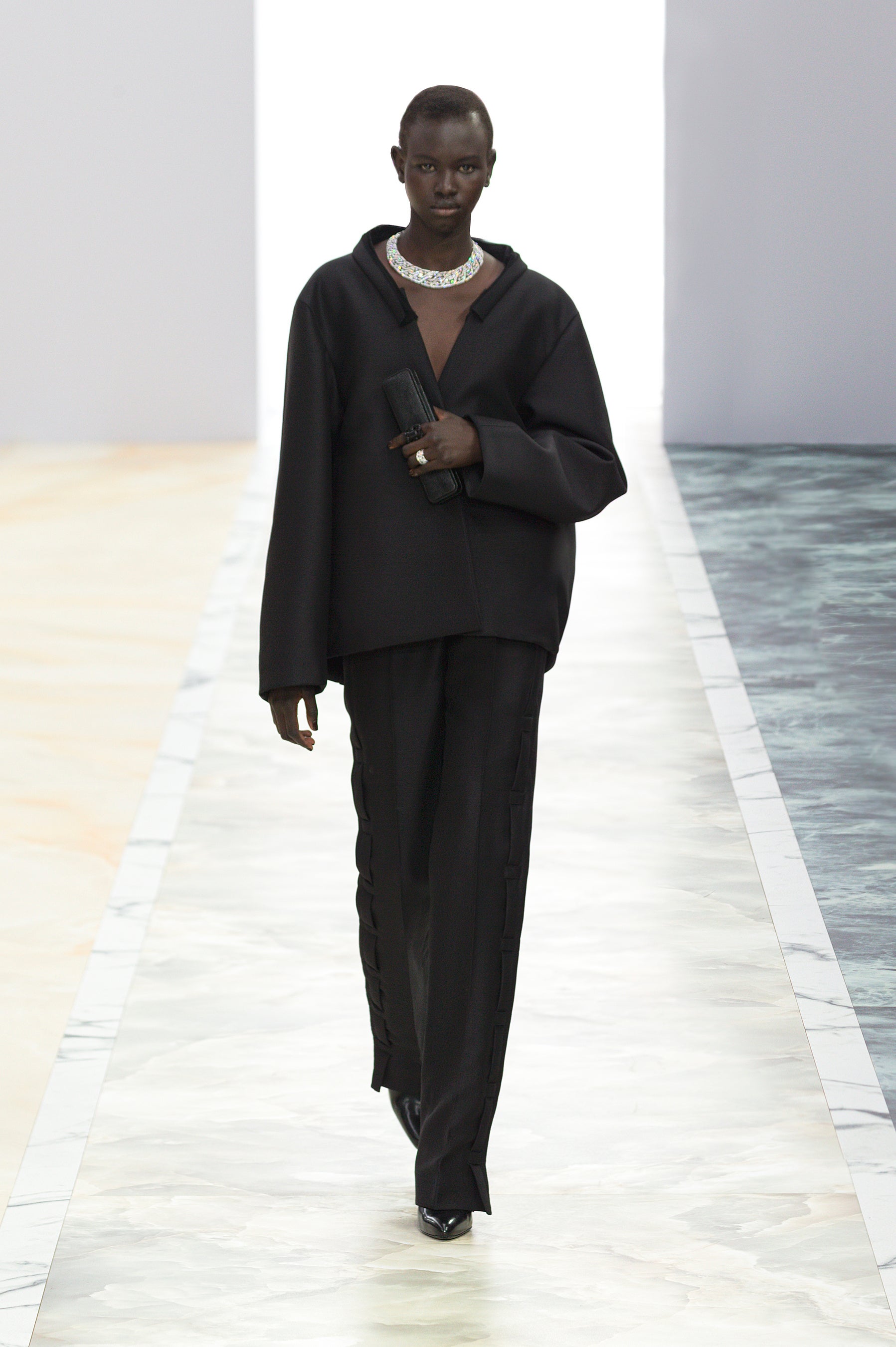 「今シーズンはクチュール技法ならではの滑らかさ、流動性、そしてフォルムに集中し、これらの要素を現代のアティチュードと結びつけたいと考えました」とクチュールおよびウィメンズウェアのアーティスティック ディレクターを務めるキム・ジョーンズ(Kim Jones)は語ります。「デルフィナ(Delfina)のハイジュエリーをベースにしたテンプレートに取り組みました。ジュエリーを身に着けないルックも、コレクションのカラーパレットや装飾を通して、衣服そのものがジュエリーのアイデアをもたらしてくれます。ブラックダイヤモンド、ルビー、サファイアなどの宝石の色だけでなく、身体色も取り入れてソフトとハード、身体と宝石の戯れが見られます」