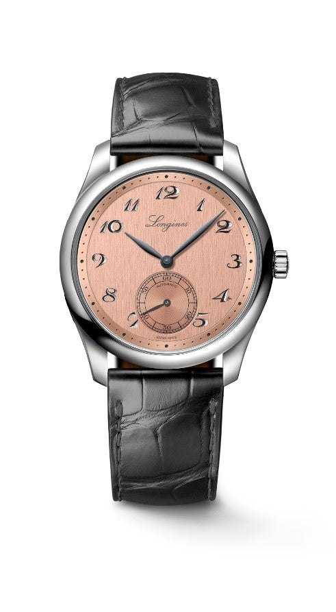 ロンジンの過去の懐中時計やヘリテージウォッチに着想を得たデザインやブレゲ数字の精巧でロマンチックなエングレービングインデックスが特徴の 「ロンジン マスターコレクション 190周年記念モデル」をベースに、ケースサイズ38.5cmを採用し、スモールセコンドを配置した新作のサーモンカラーを先行予約販売。
