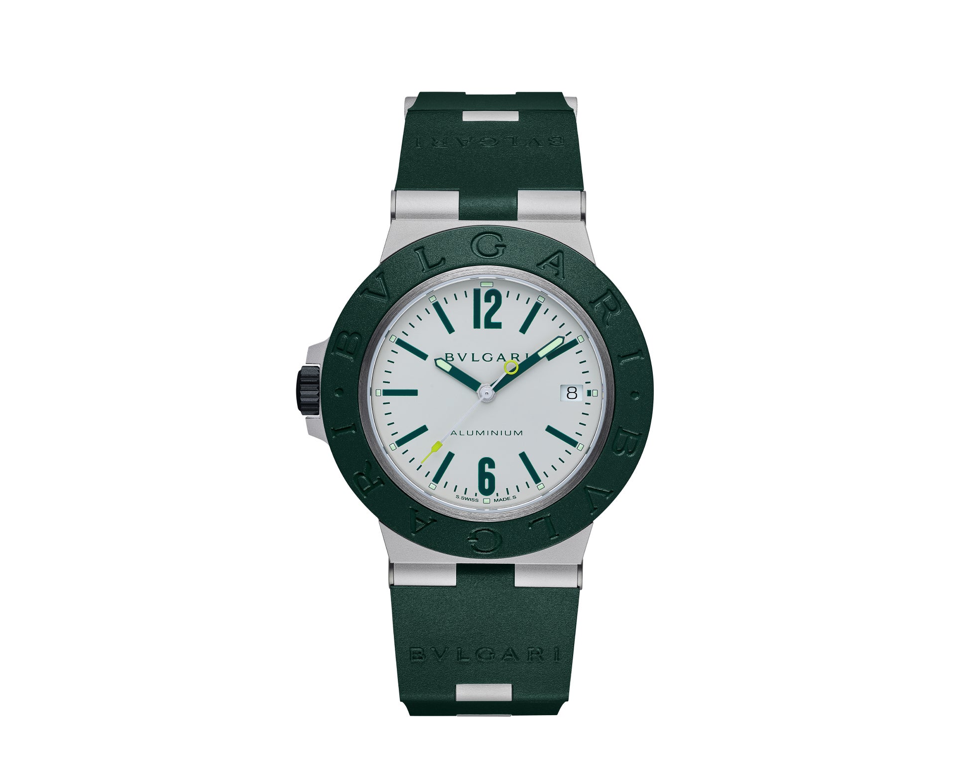 マッチポイントのグリーン 今年発売となる「ブルガリ アルミニウム マッチポイント 限定モデル」のカジュアルなスタイルとモダンな美しさはテニス愛好家の人たちにはとくに魅力的に映るはずです。スポーティな空気をまとったこのタイムピースは好きなスポーツを極める楽しさを身近なものにしてくれます。クラブハウスだけでなくコート上でも着用しやすいグリーンのカラーで、ベルクロ(R)ストラップと左手用リューズにより最高の着用感を実現します。