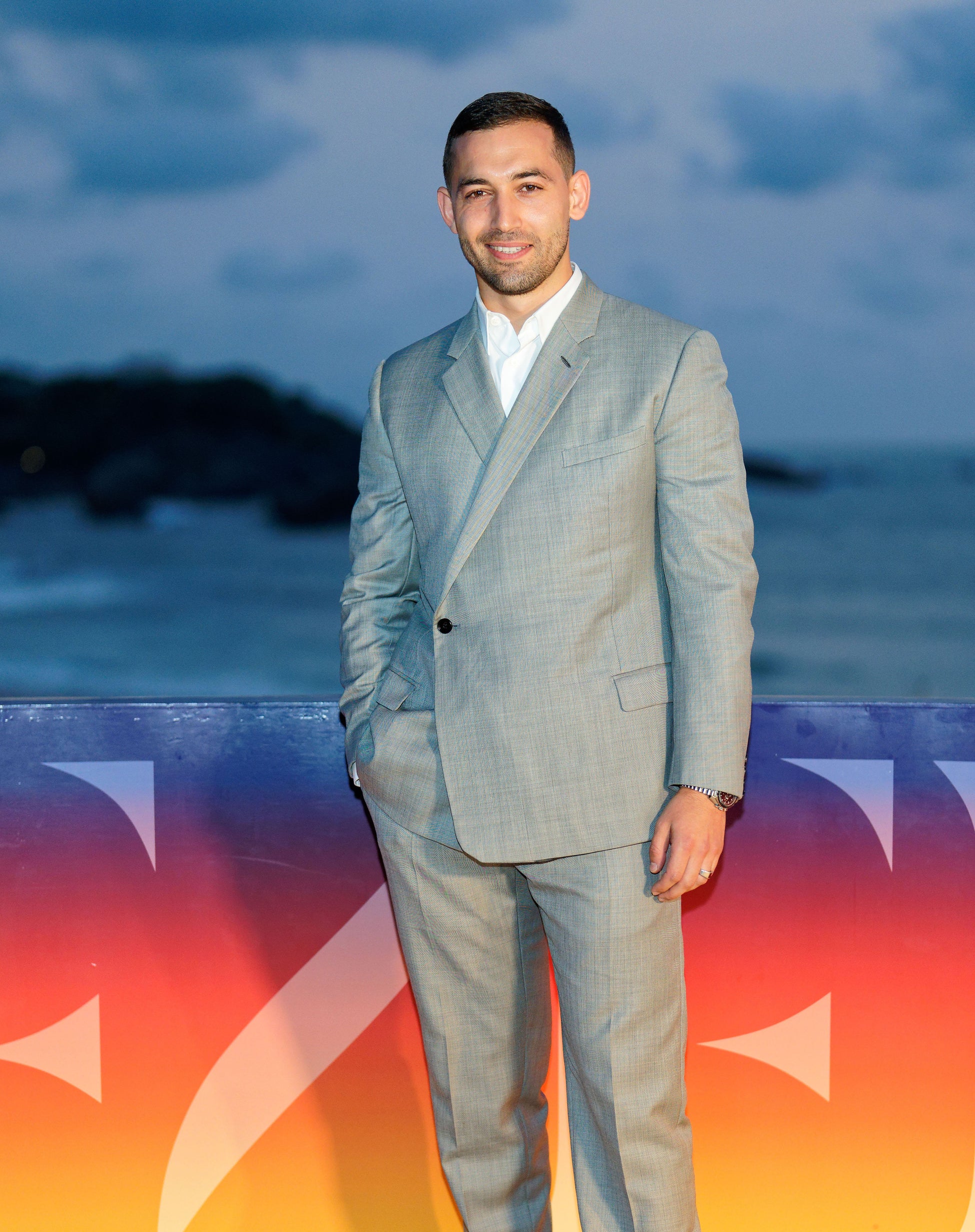 ビアリッツ映画祭に出席したダリ・ベンサラ。キム・ジョーンズによるディオールのメンズ コレクションより、グレーウールの「テイラー オブリーク」ノッチラペルスーツにクラシックなホワイトコットンシャツを合わせた装いで登場しました。