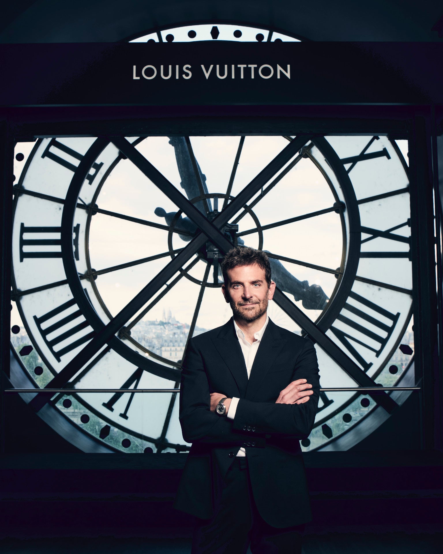 ブラッドリー・クーパーは、ネイビーのシングルブレストスーツに、シルバーグレーの文字盤の新作「タンブール」を着用。
