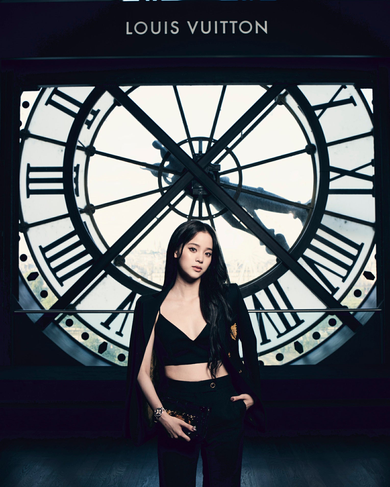 オーヤン・ナナはブラックタキシードパンツにスパゲッティストラップのクロップトップ、ブラックのタキシードブレザーを着用し、ブラックレザーのプティット・マル、ルイ・ヴィトンのウォッチをでルックを完成させました。
