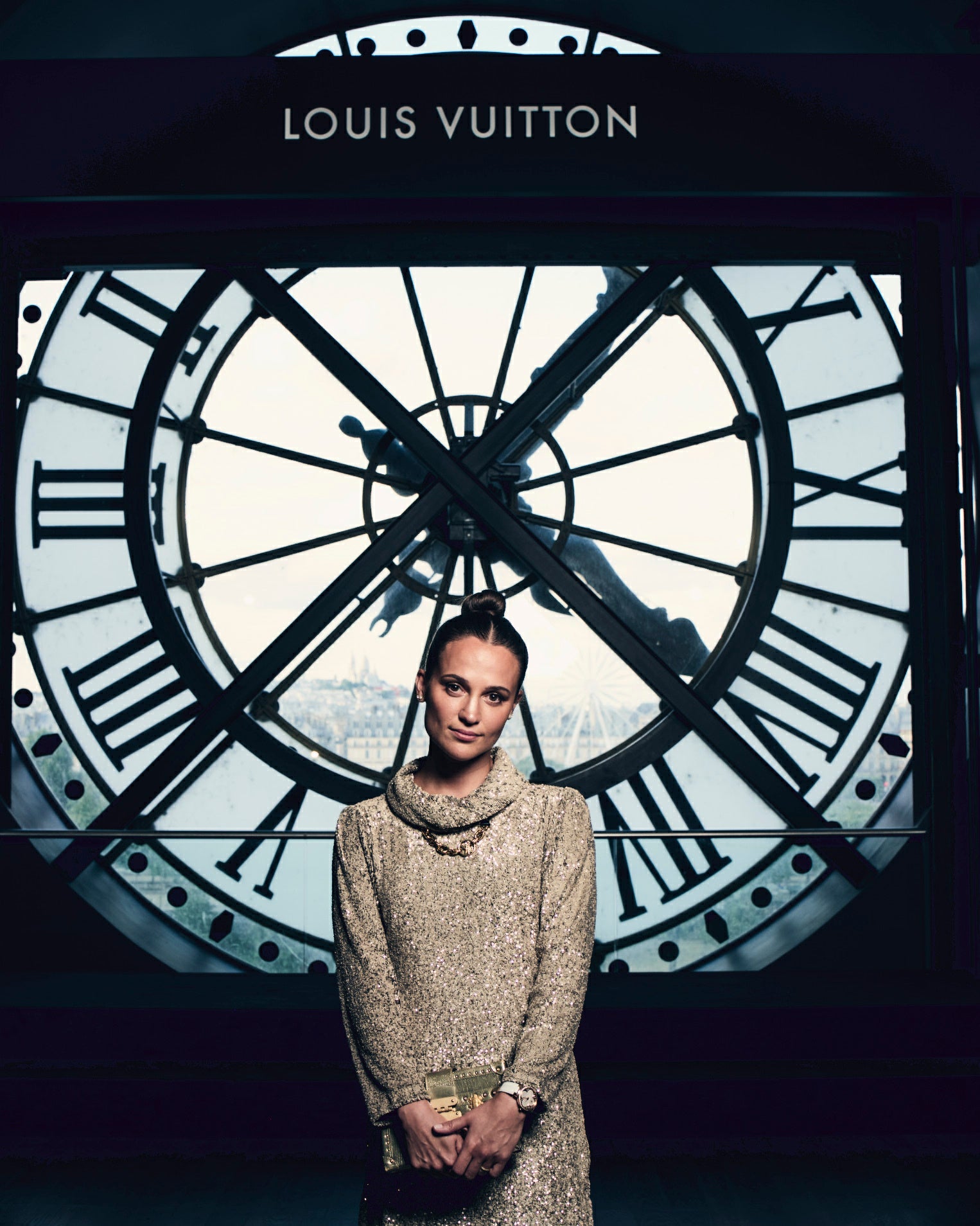 アリシア・ヴィキャンデルは、ゴールドの刺繍入りドレスにブラック・サテンのサンダル、ゴールドのレザーバッグ、ルイ・ヴィトンのウォッチを着用。