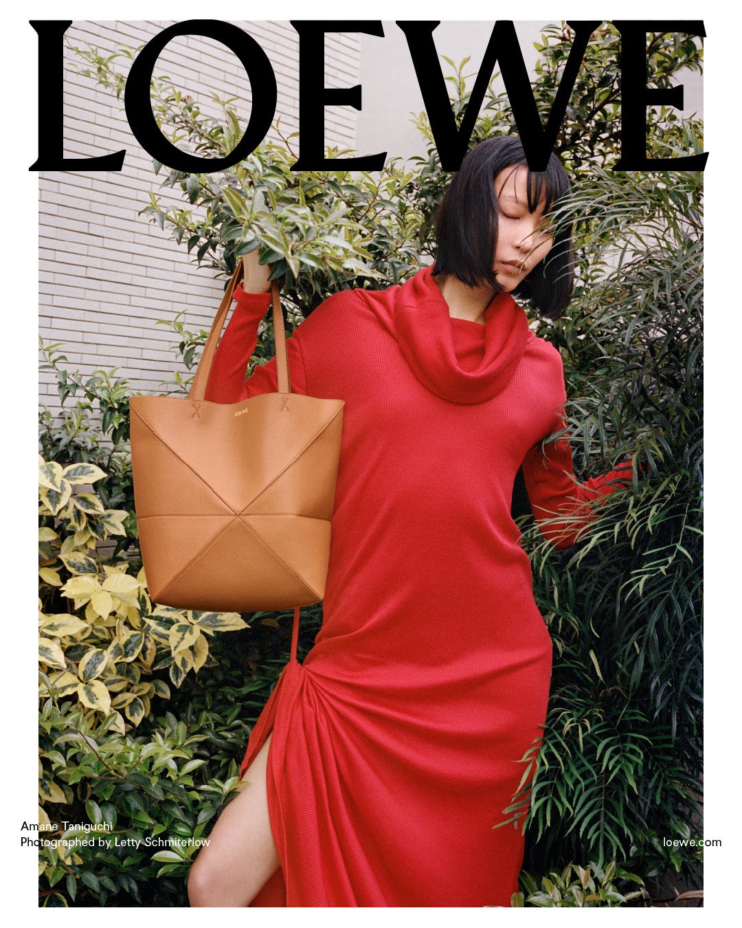 3人目の出演者、モデルのAmane Taniguchiはミディアムサイズのパズルトートを、レッドのカウルドレスにあわせています。シーサイドブルーがあざやかな、ラージサイズのパズルトートを手にしたカットも。忽那氏とTaniguchi氏の着用するロエベ トイは、ロエベのあらたなアイコンシューズです。