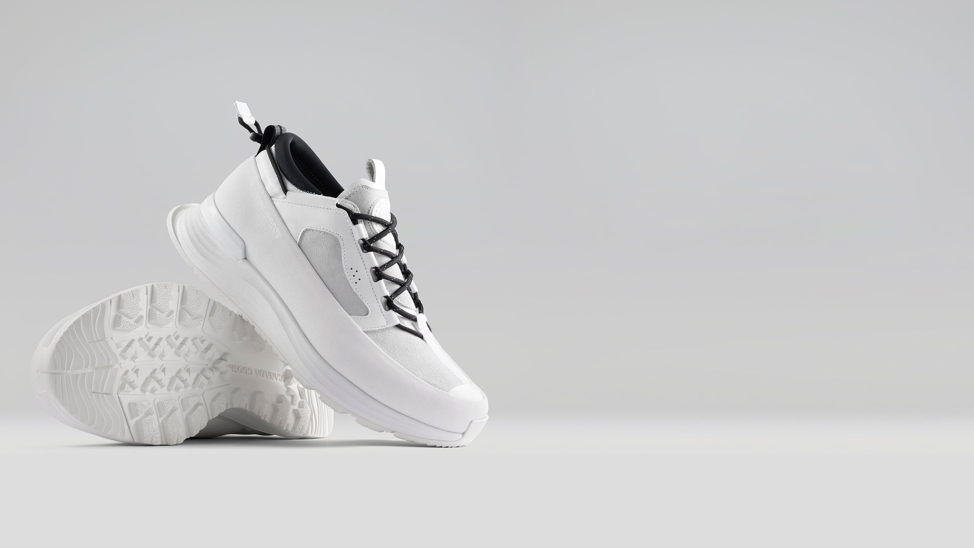 スリムでシンプルなデザインは、伝統的なトレイルシューズに代わるラグジュアリーな履き心地を提供します。上質なレザーとスエードを組み合わせ、ベージュとホワイトを使用したニュートラルなカラーを展開。ブランドのアイコンであるディスクロゴのメープルリーフから着想を得たアウトソールや踵部分のフレアで接地面を広げ、滑りにくい設計に仕上げています。