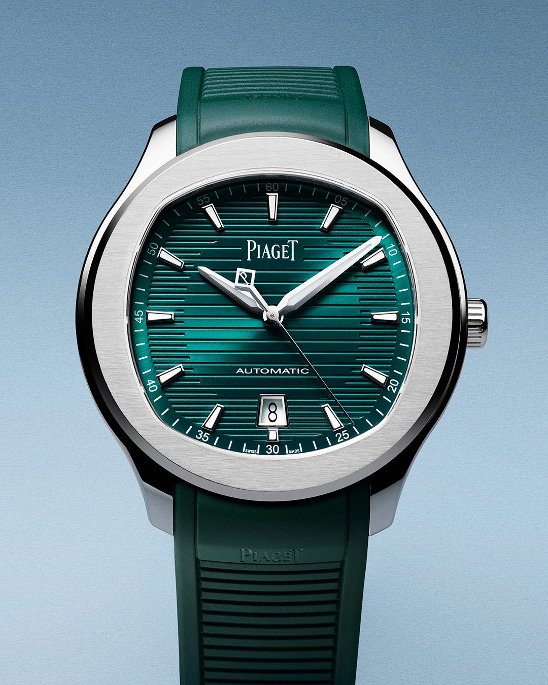 新作のピアジェ ポロ フィールドでは、太目にデザインされた文字盤のゴドロン模様がラバーブレスレットのラインと見事に調和し、コレクションのDNAである横線のモチーフを強調します。ピアジェ ポロは人生を謳歌し、常に挑戦し続ける人々のためのコレクションです。