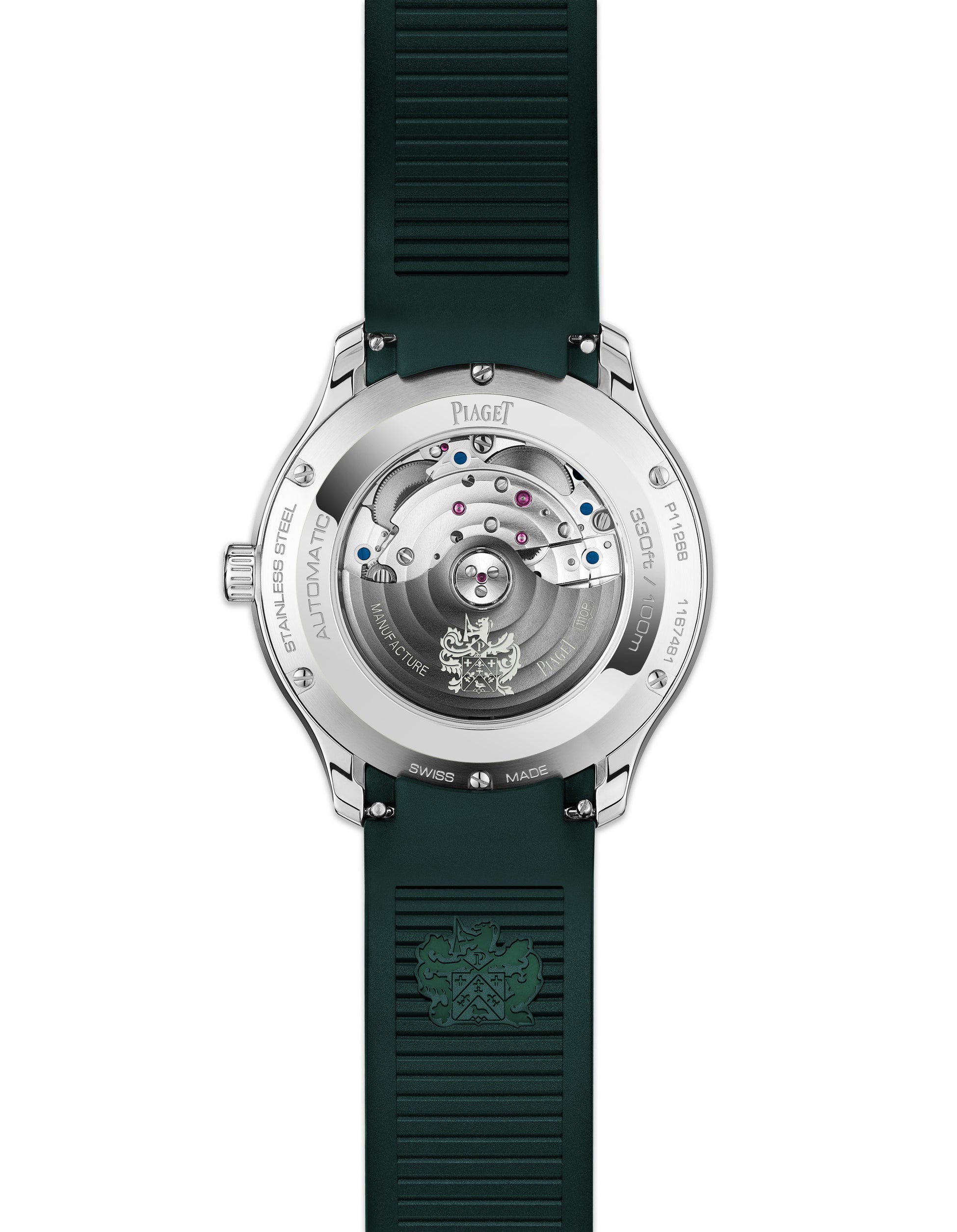 仕様:ケース径42mm、厚さ9.4mm、ステンレススチール製ケース、グリーン文字盤、スーパールミノバ加工されたインデックスと針、サファイアケースバック、インターチェンジャブルラバーストラップ、1110Pピアジェ自社製自動巻ムーブメント。