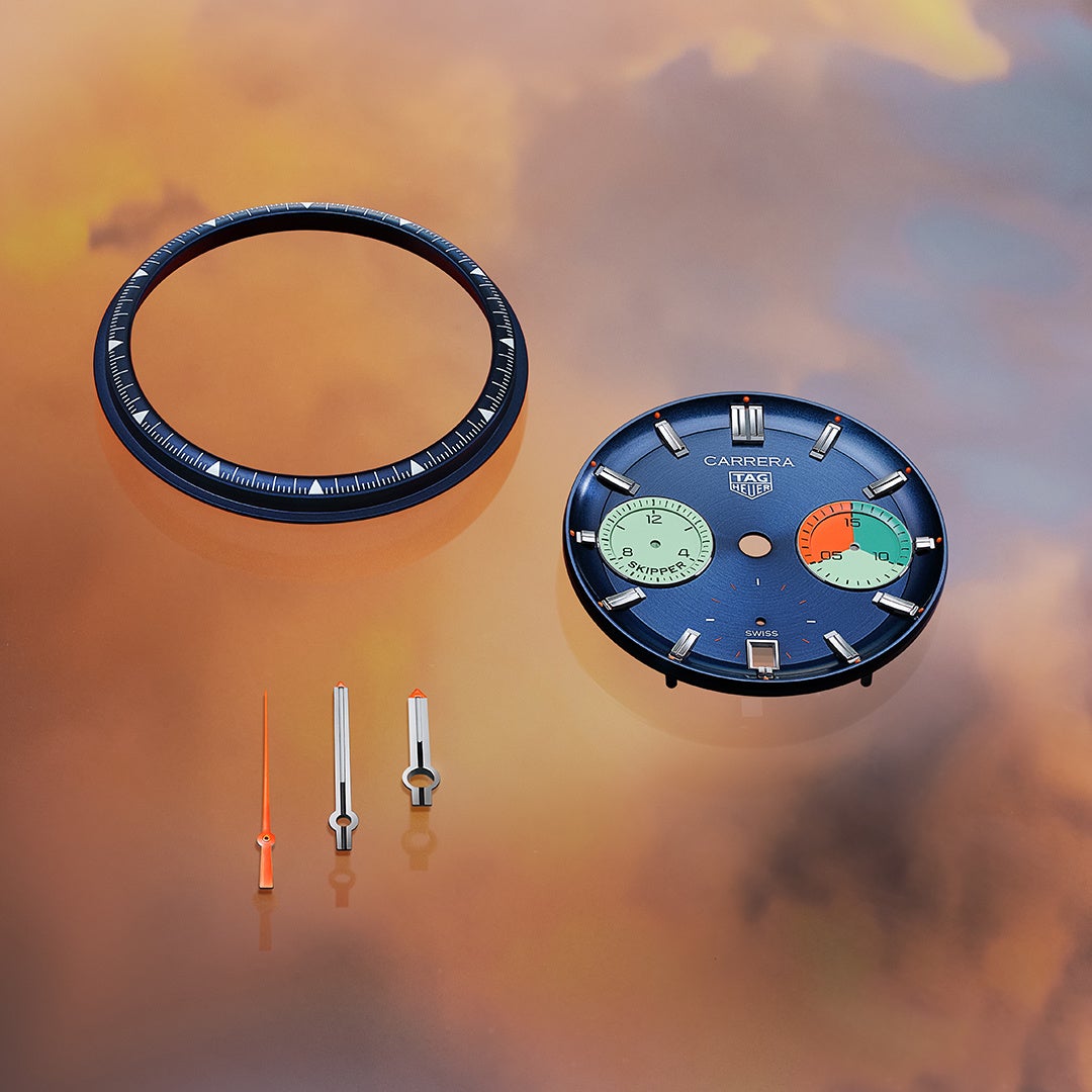 新たな「スキッパー」はオリジナルモデルの個性的でカラフルな装いを再現し、メインダイヤルには「カレラ」を象徴するブルー(海の色から着想した色調)を採用。このブルーとコントラストを成す「イントレピッド・ティール」ブルーの12時間計カウンター、そして3分割した15分計レガッタカウンターにはそれぞれ、イントレピッド・ティール、ラグーングリーン、そしてレガッタオレンジの3色を配しました。