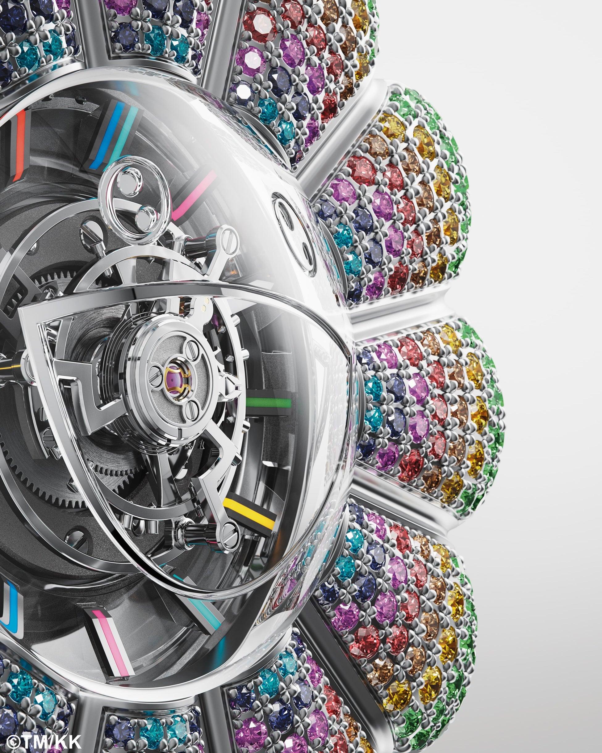 トゥールビヨンやインデックスから花びらに至るまで、村上隆の色彩豊かで詩的な美しさのファンは、このMP-15の内部から外観まで、彼の描くリズムをたどることができるでしょう。444個のジェムストーンを豊かにあしらった12枚の花びらが、このタイムピースに明るく楽しげな美学をもたらしています。まるで本物の花のように、花びらはムーブメントの中心に向かって傾斜しています。はっきりとした鮮やかな色の境界線は、オンリーウォッチ2023を象徴しています。このアイデアは、伝統的な虹色のグラデーション効果ではなく、子どもがクレヨンで遊ぶように、色の明るさとジェムストーンの輝きで遊び、手首に鮮やかなスーパーフラットアートを 作り上げるイメージです。