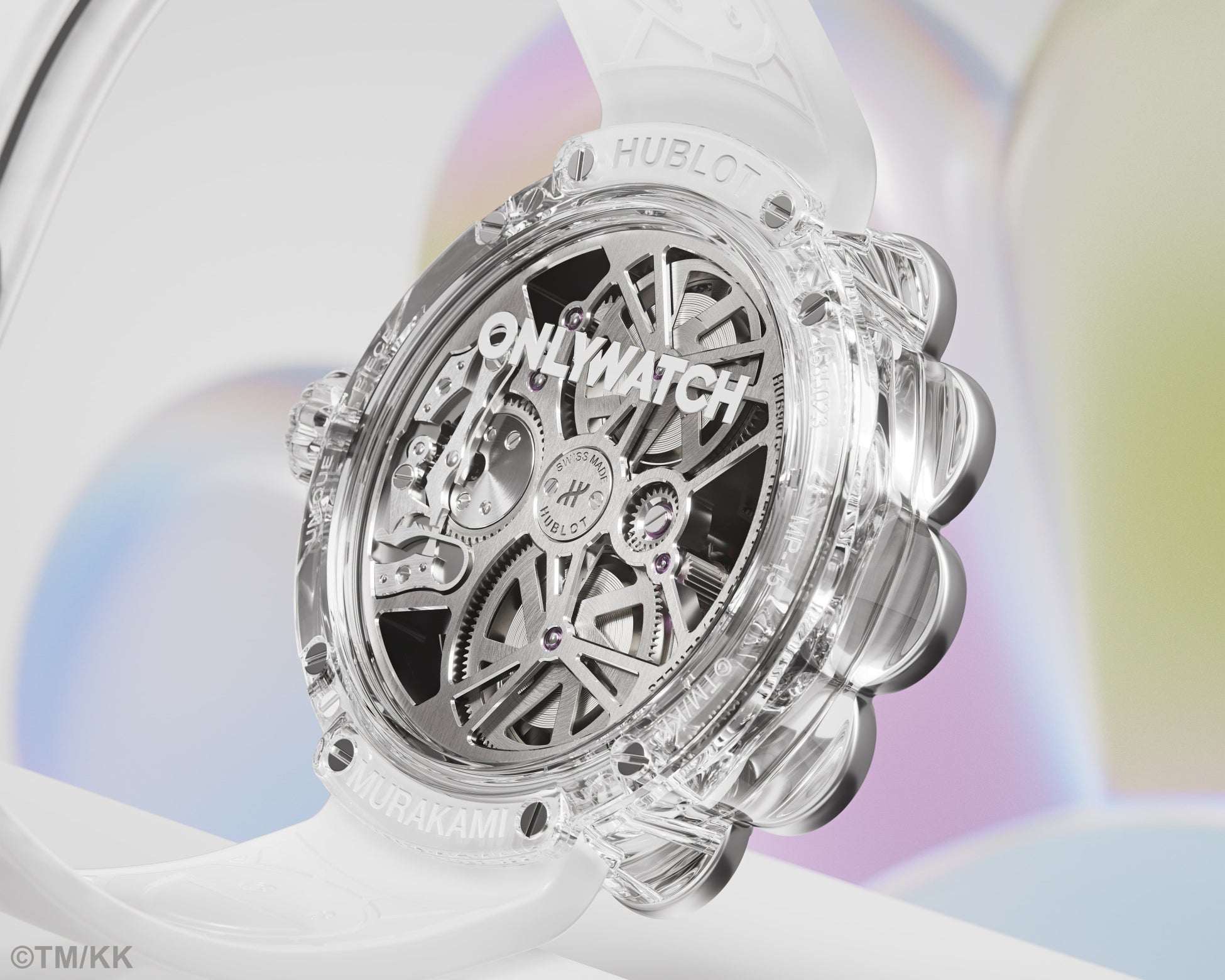 このセンター・トゥールビヨンは、アートとウォッチデザインの融合を象徴しています。これは、ウブロのオートオルロジュリーへの献身と、村上隆の世界観が共鳴したアイデアです。このアイデアは、もちろんオートオルロジュリーが物理的に中心となることを意味しますが、それだけではありません。時計の心臓部であるトゥールビヨンは、デュシェンヌ型筋ジストロフィーの研究支援のためのオークションで、この時計を購入した人の心、そして、病と闘う子どもたちの心を示しています。