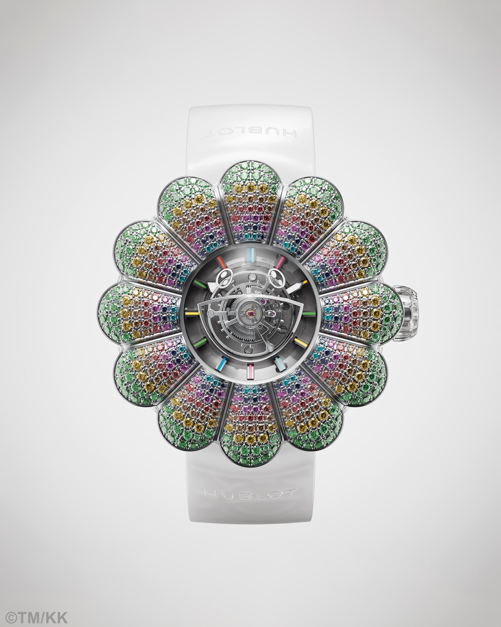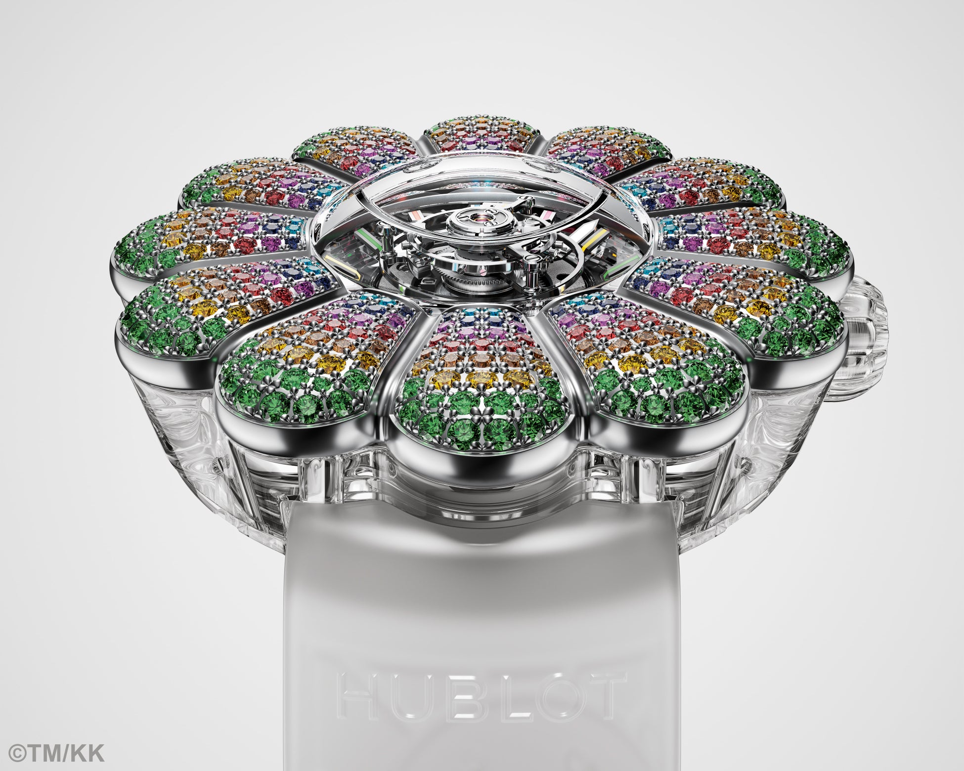 中央のトゥールビヨンは、ウブロがオートオルロジュリーに再びスポットライトを当てようという意図だと解釈することができます。または、そのラウンドケースは、子どもが描いた12枚の花びらのデイジーに、希望の証としてグリーンを加えたようにも見えます。「MP-15 タカシムラカミ トゥールビヨン オンリーウォッチ」の最大の特徴は、誰もがこの時計を、自分の大切なものの象徴として捉えることができる点にあります。先端技術、精巧さ、遊び心、ユニークさ、催眠術…、色彩の数だけ、その価値が開花するのです。村上隆のアイコンで ある「お花」に着想を得たこの時計は、オートオルロジュリーとオートジュワイアリーが融合した、クリエイティブなタイムピースです。