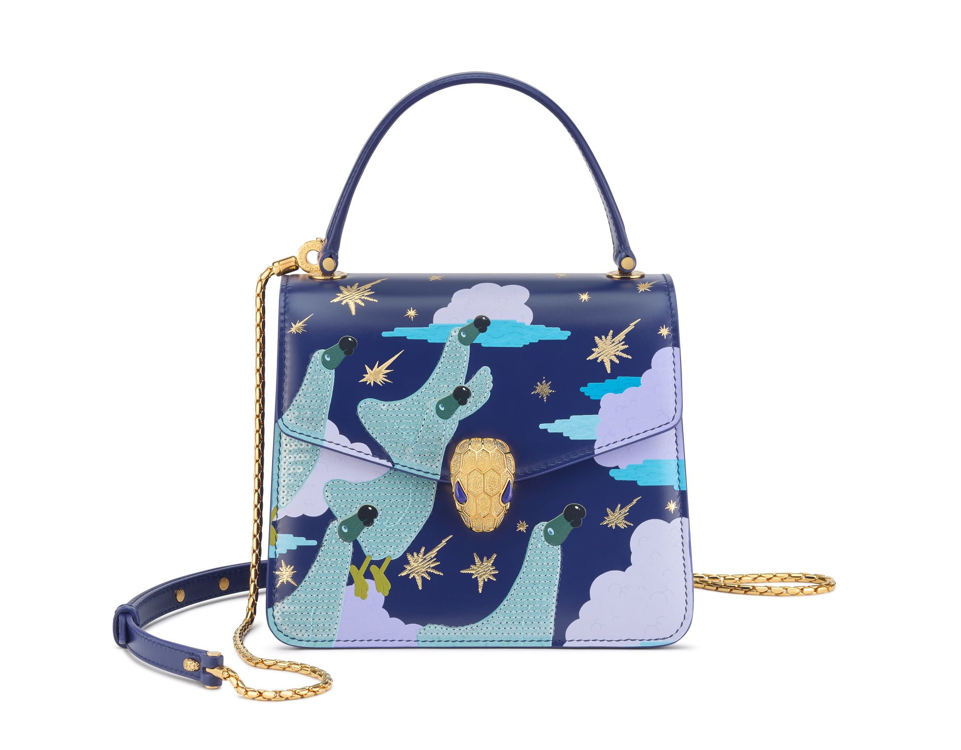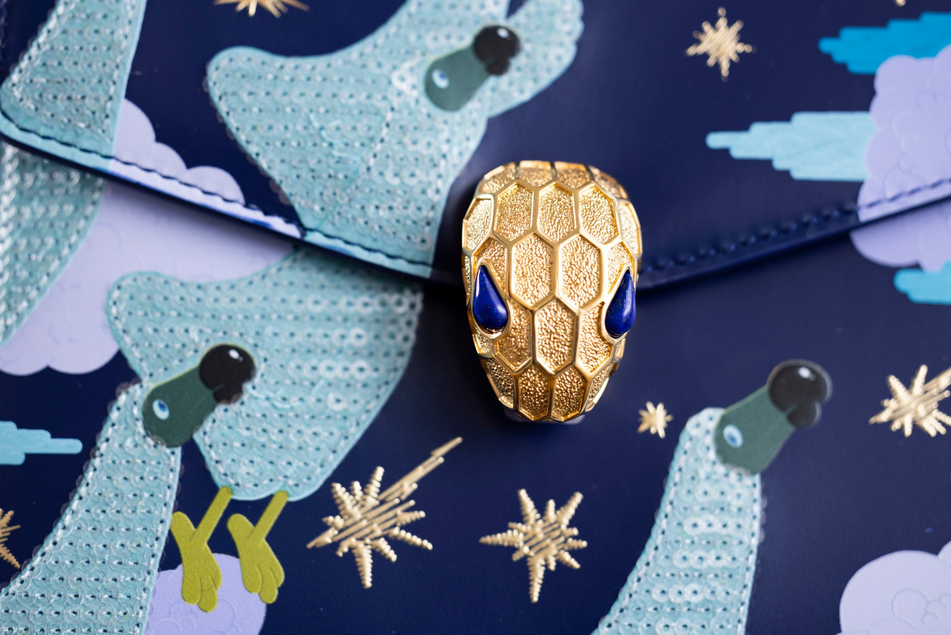 ナイト バージョンは夜の景色に溶け込んでいくようなデザインで、ブルガリのアイコンであるエイトポイントスターが散りばめられています。ゴールドのグリッターのディテールや刺繍の装飾に照らされた夜空には、象徴的なドードーがあたかも自分の夢を追いかけるかのように飛んでいます。バッグにゴールドの輝きを添える魅惑的なスネークヘッド クロージャーは表面にいわゆる「ダイヤモンドカット」調の加工を施し、きめの粗いメタリックな質感がスノーセッティングパヴェのように光を揺らめかせます。また、瞳にはうっとりするような魅力を湛えたラピスラズリをあしらっています。