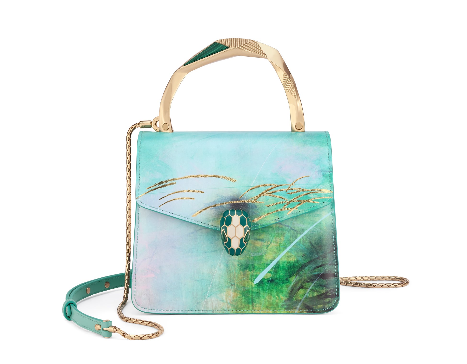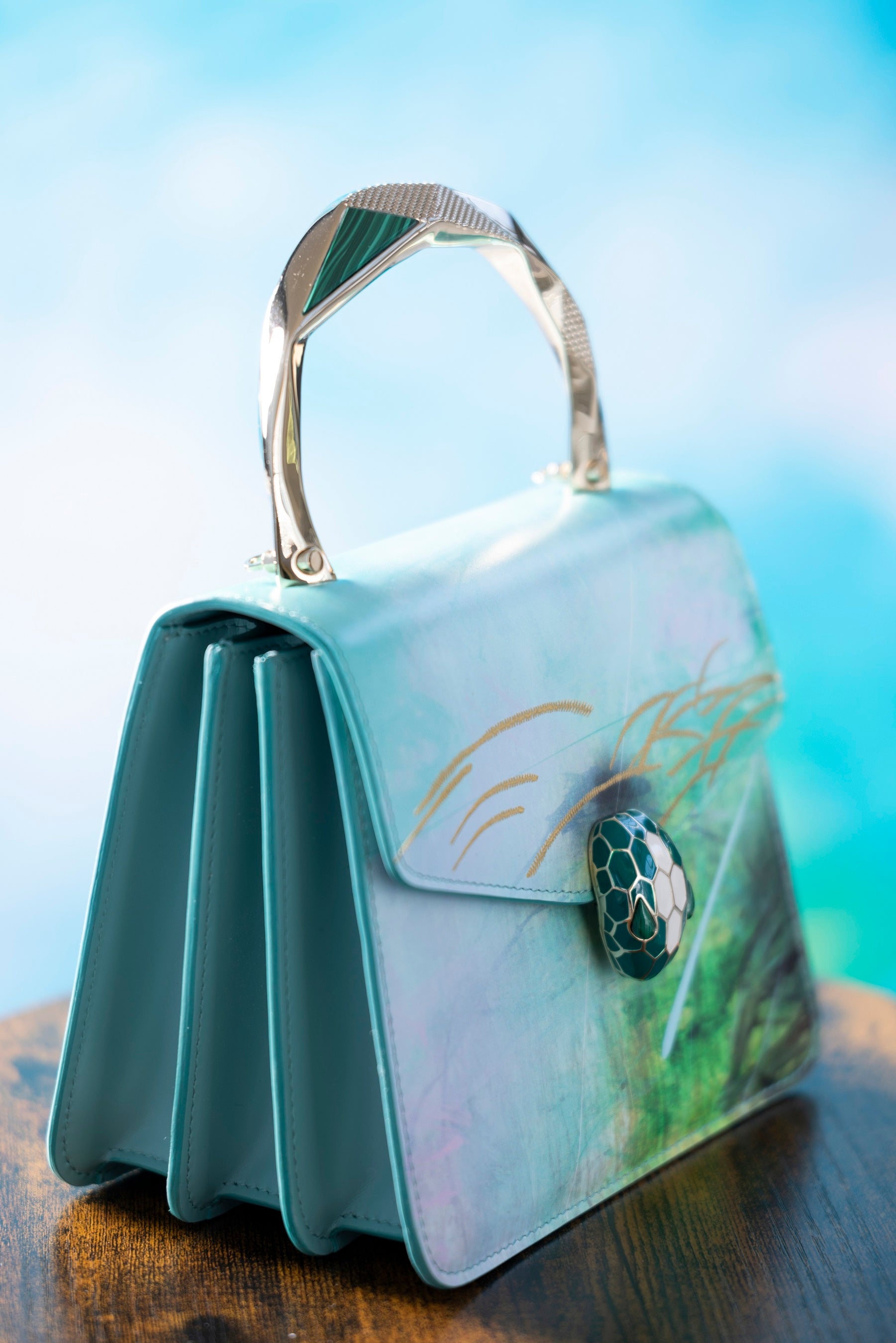 絵画から彫刻、インスタレーション、パブリックアートまで、多面的な才能を発揮する中国人アーティストのジョウ・リは、叙情的な抽象絵画の独特な表現を通して、セルペンティ フォーエバー トップハンドルを再構築しています。そのイメージからオーシャン と名付けられた1つ目のクリエーションは、彼女の絵画作品のシリーズで人類の自由と希望をテーマにした《Landscape of Nowhere: Water and Dreams》がベースとなっています。ブルーとピンクのアイコニックな組み合わせとジョウ・リの繊細な絵筆のタッチがカーフレザーのボディに新たな生命を吹き込み、夢のような世界を描き出します。