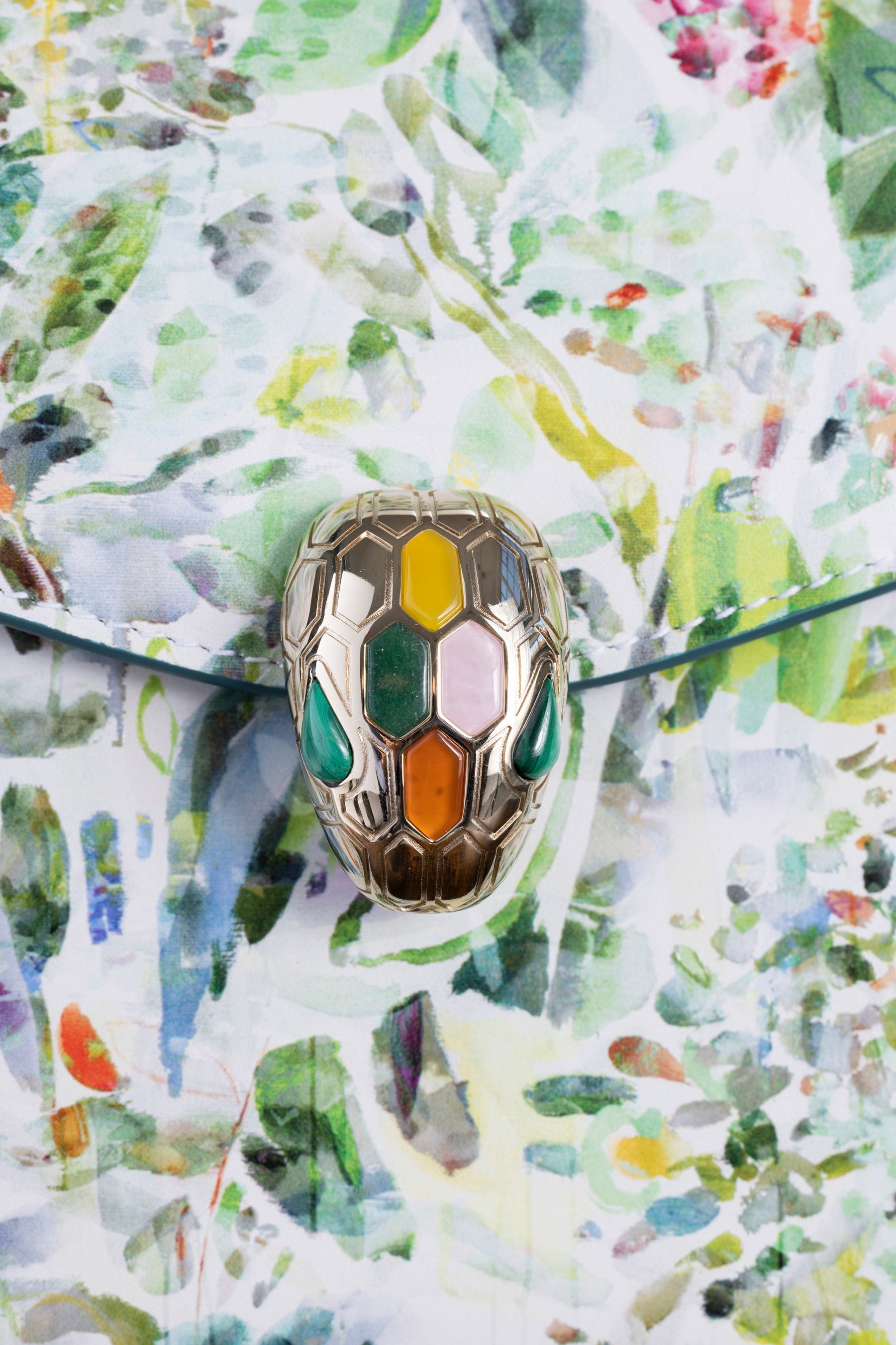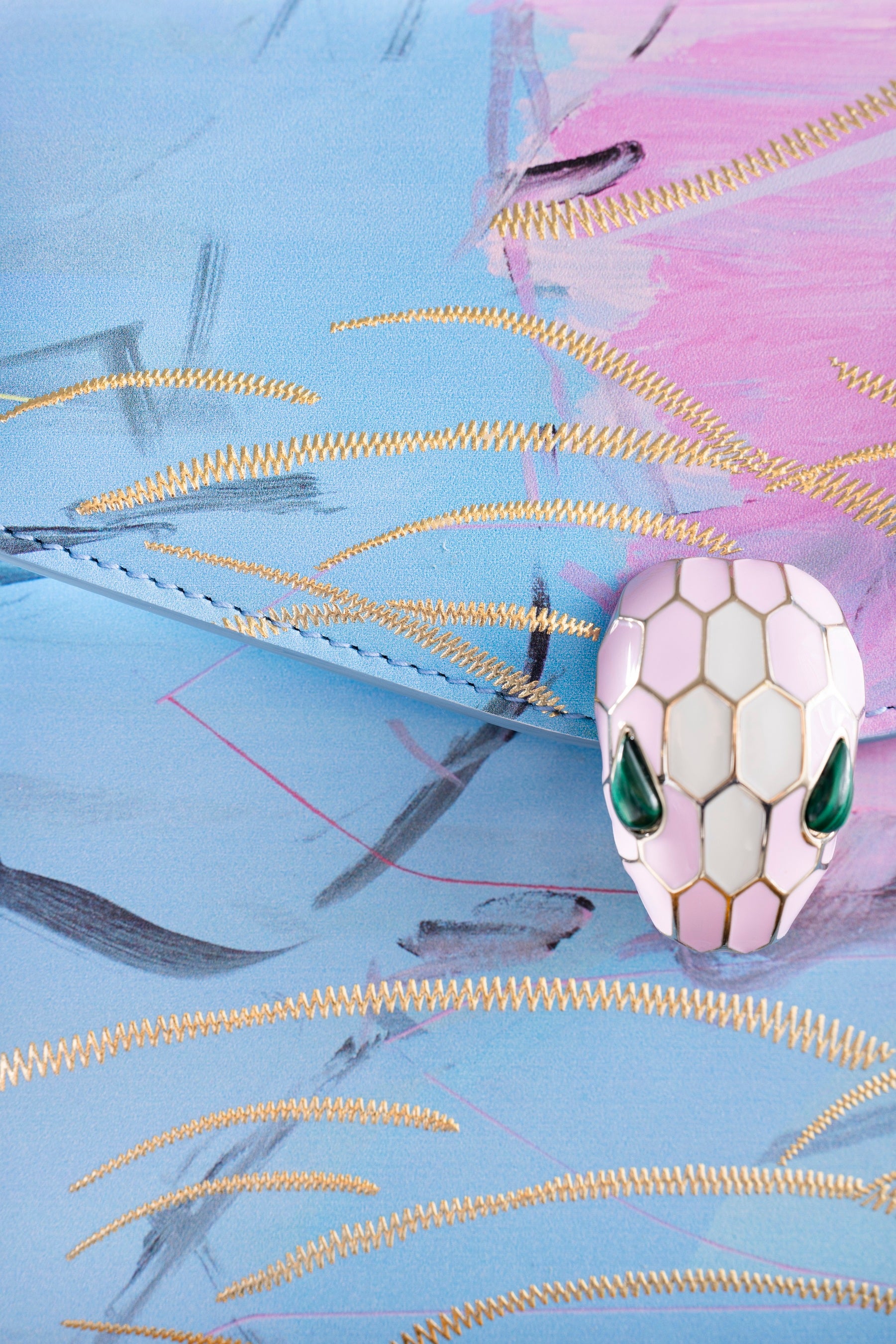 どちらのバッグも、ボディと同系色のエナメルを鱗に施したアイコニックなスネークヘッド クロージャー、そしてにゴールドのミラー仕上げが施された幾何学的なフォルムのトップハンドルを合わせています。このハンドルには、バッグの色に合わせた幾何学的なフォルムのマラカイトまたはピンククォーツのがあしらわれており、ここにもジョウ・リとブルガリがそれぞれに生み出す芸術の出会いが表現されています。この新たに生まれ変わったデザインは、彼女のインスタレーション作品《Metamorphosis - The Ring of Life》をベースとしており、中国文化とヨーロッパ文化、理性と活力、金属と宝石、アール・ヌーヴォーとミニマリズムの結合を象徴する存在として、蛇を称えています。