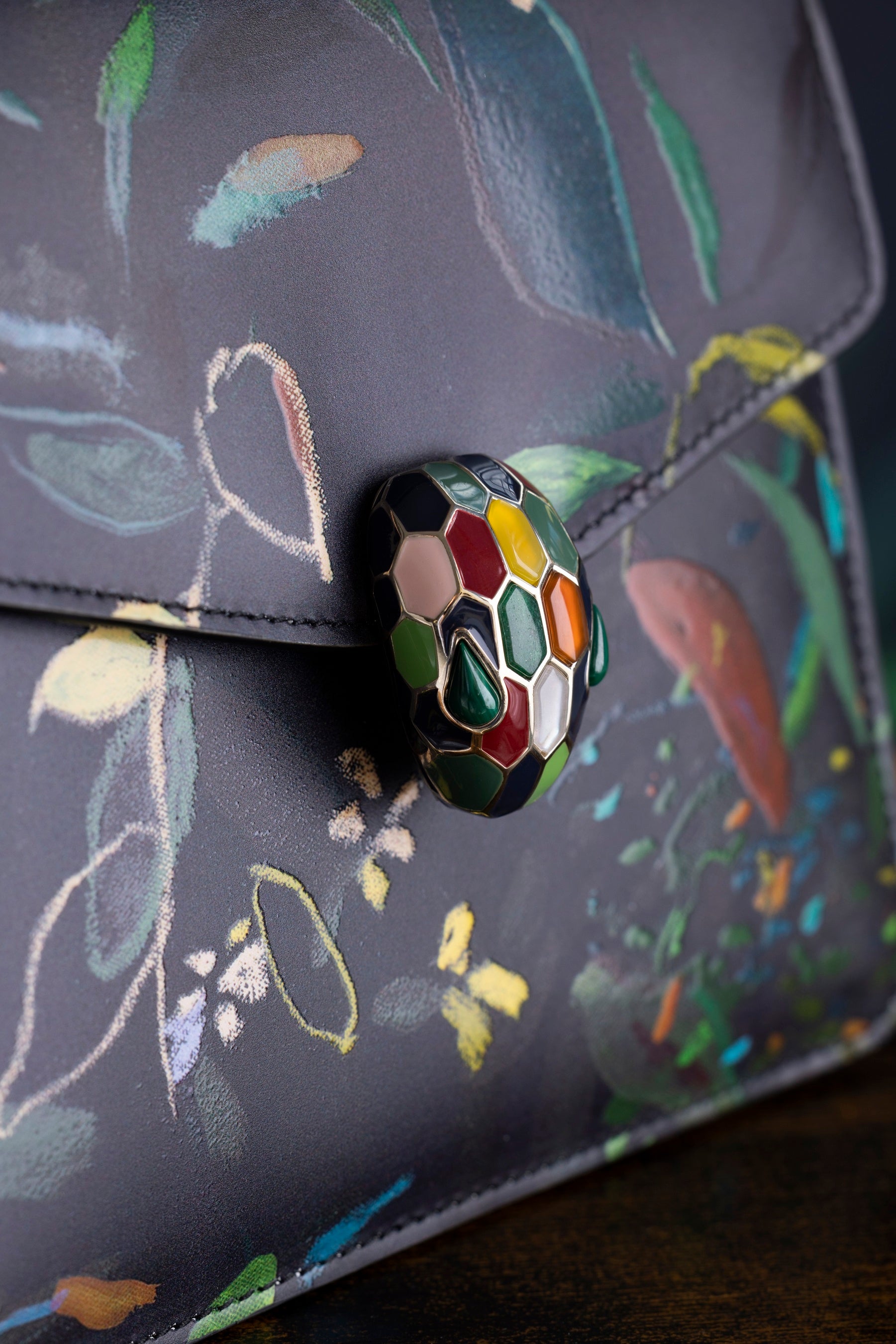 自然から着想を得たモチーフは、キッチングの2つ目のデザインにも活かされています。鮮烈な色彩と、ベースとなるブラックのカーフレザーとの魅惑的なコントラストは、彼女の絵画作品 Nocturneからインスピレーションを得ており、蛇の神秘的なフォルムと変容を示唆しています。