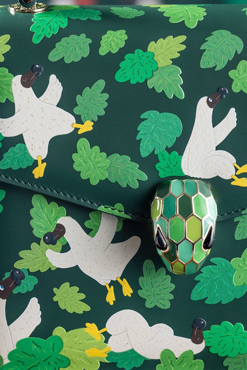 自由と幸福の探求を表す象徴的な鳥、ドードーのモチーフで知られる韓国の画家、ソヌ・キムはセルペンティ フォーエバー トップハンドル バッグの中心に彼のアーティスティックな世界を持ち込みました。時代を超えたエレガンスとシーンを選ばない使いやすさを特徴とするこのバッグは、2種類の魅力的なデザインが用意されています。空想の森が描かれたデイ バージョンは、カーフレザーのボディにグリーンの葉がエンボス加工され、立体感とこのイメージの躍動する質感を際立たせています。フラップカバーの下には遊び心あふれるモチーフが隠されており、愉快なドードーが美しい葉陰から飛び出しています。ボディの色と合わせたスネークヘッド クロージャーはグリーン系の豊かなカラーパレットによるエナメルが施され、瞳にはブラックオニキスがあしらわれています。