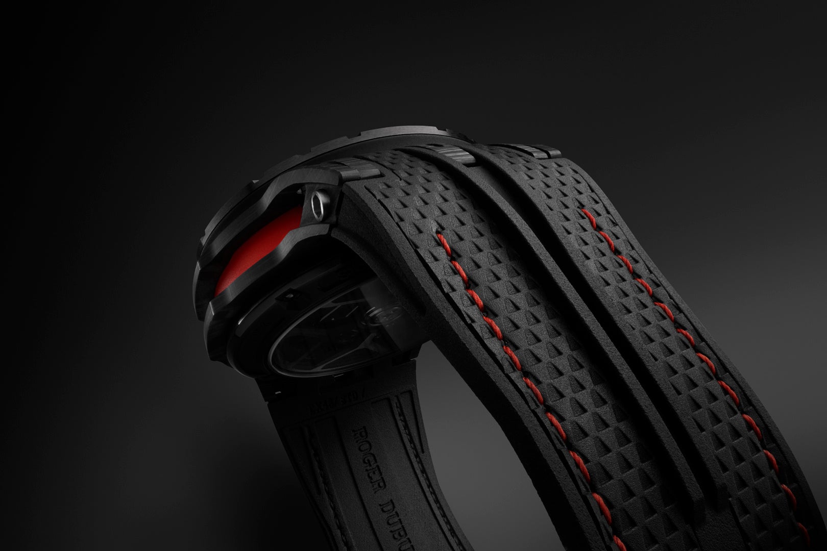 ケースバックでさえ、息をのむほどのインスピレーションで溢れています。ロジェ・デュブイのシグネチャーコード、シャープなラインが際立てられた5本アーム装備のローターの形状は、スーパーカーのホイールのリムさながらの様相で、モータースポーツとメゾンの強いつながりに刻印を打つデザインとなっています。
