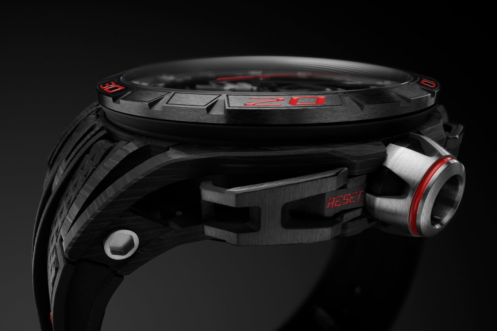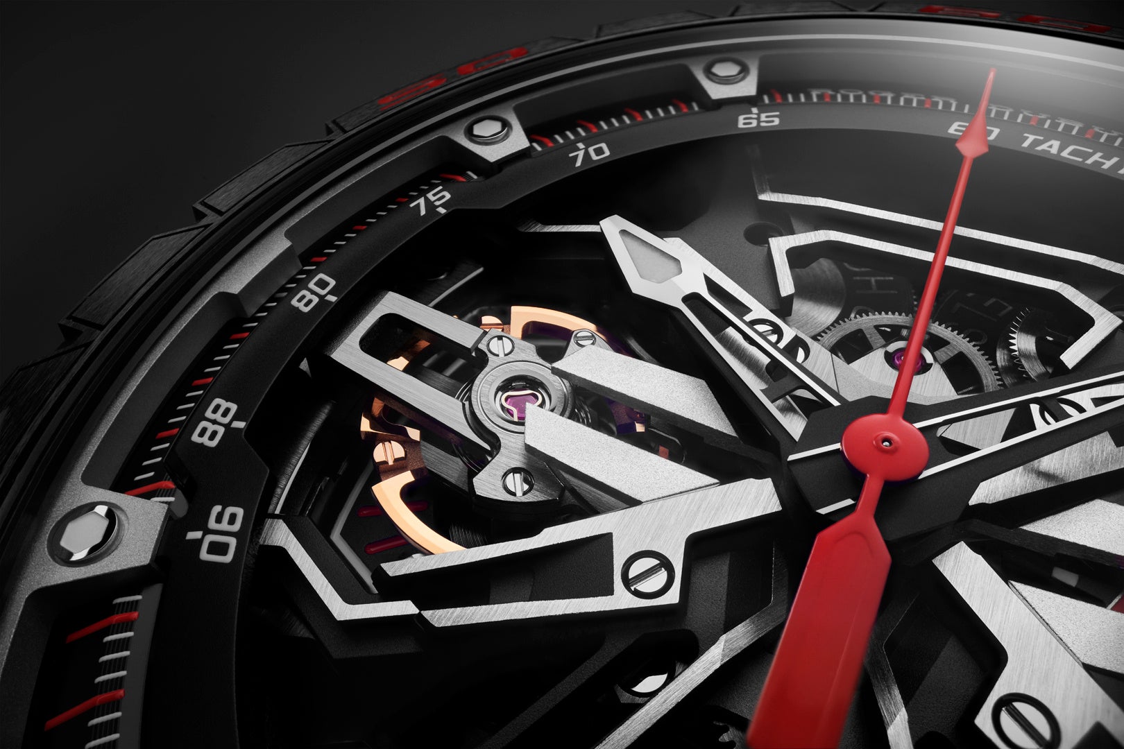 また、その流線的なラインでスピードが持つ敏速性を疾風のごとく体現しています。スケルトン仕上げのプッシャーに加え、ダイヤルを囲むセラミック製ベゼルは優れた耐傷性と時間が経っても変色しにくい性質を備えています。スーパーカーのブレーキなど、敏感で重要とされるコンポーネントに多く採用されているカーボンとセラミックの混合素材が、モータースポーツへ捧げるトリビュートを表現しています。