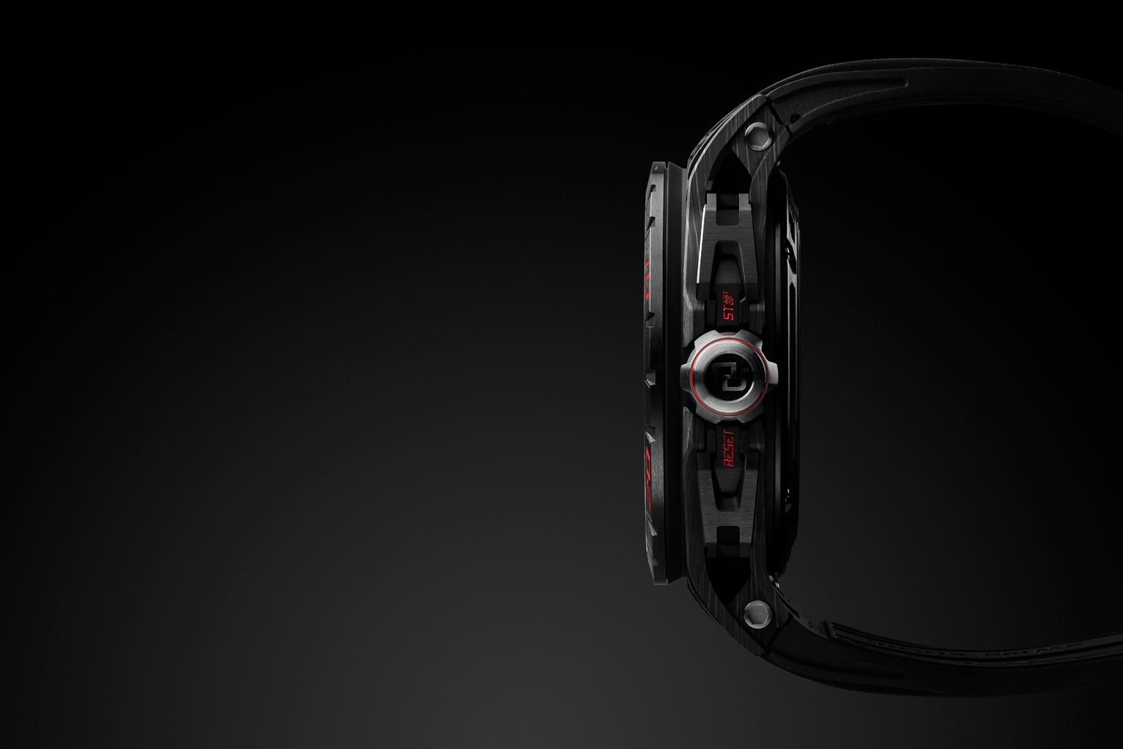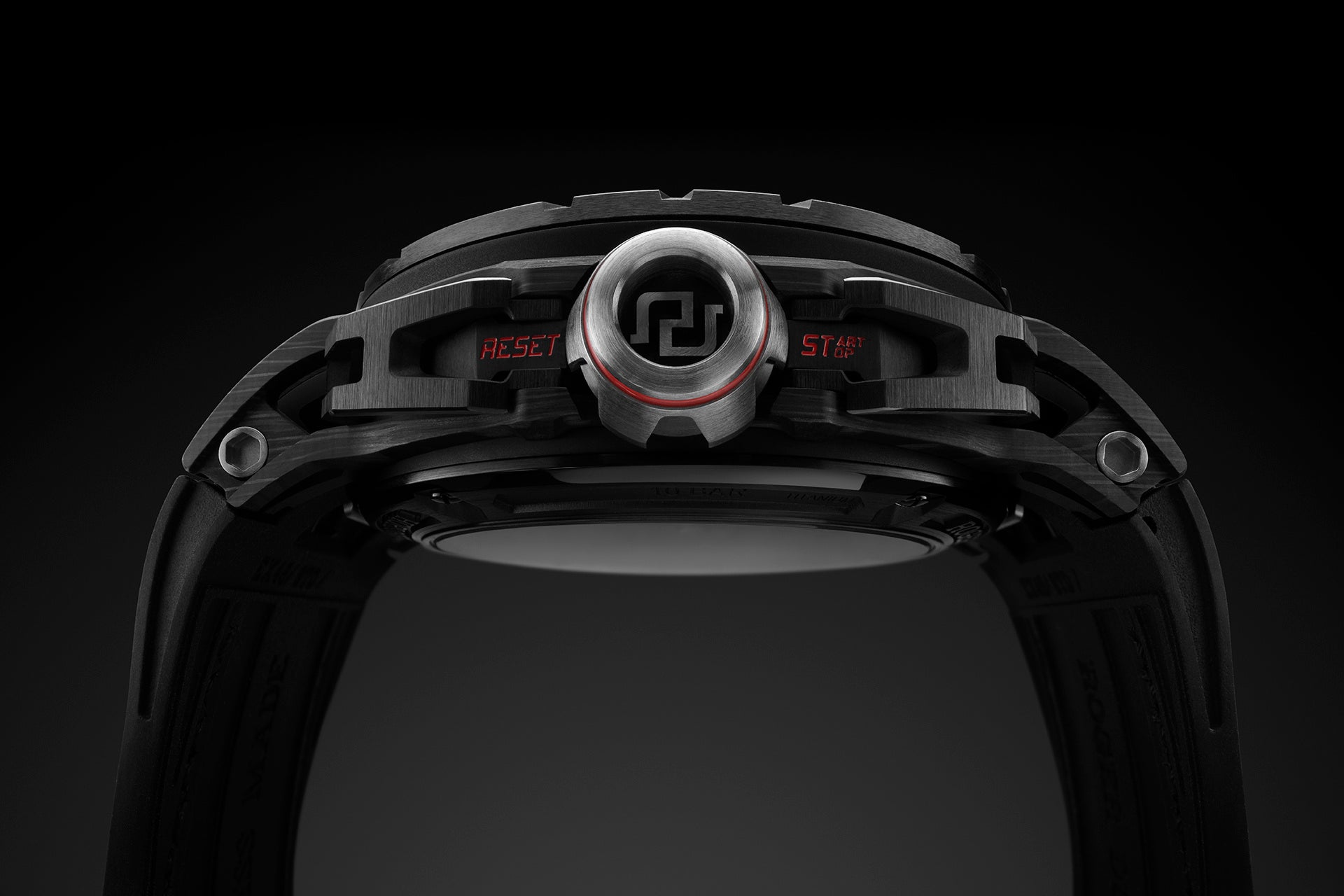 最後に、エクスカリバー スパイダー フライバック クロノグラフが鎮座するストラップに目を向けると、そこにも圧倒的なインパクトが。さらなるボリュームを追加するため、ノッチが施されたラバー製ブラックストラップの内側には 軋んだタイヤ痕を想起させる独特のパターンが施され、さらにはスピードを求めるエクスクルーシブなメンバーのユーザビリティを考慮し、数秒でストラップを交換できるクイックリリースシステムを採用。シーンに合わせて付け替えられる多様性も高めています。
