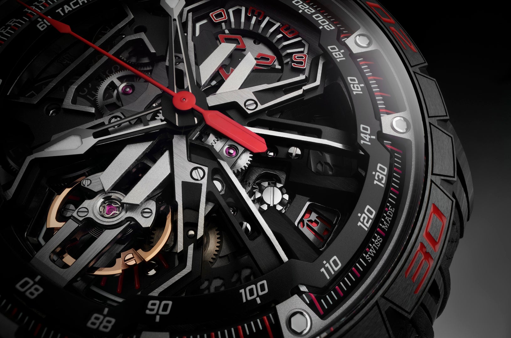改めて、このタイムピースのあらがえない魅惑に目を向けると、様々な表面層の奥行きを創造した、ロジェ・デュブイの多次元デザインへの熱烈な傾倒が見えてきます。自由に浮遊するようなフローティングタキメータースケールから、下部に配した日付表示、そして立体的に配した秒針に至るまで、これらの平行な配置面があらゆる角度と高さに配置され、視線を投げかける度に新しい発見に捉われる、ダイナミックで表現力溢れる構造が唯一無二の魅惑を放ちます。
