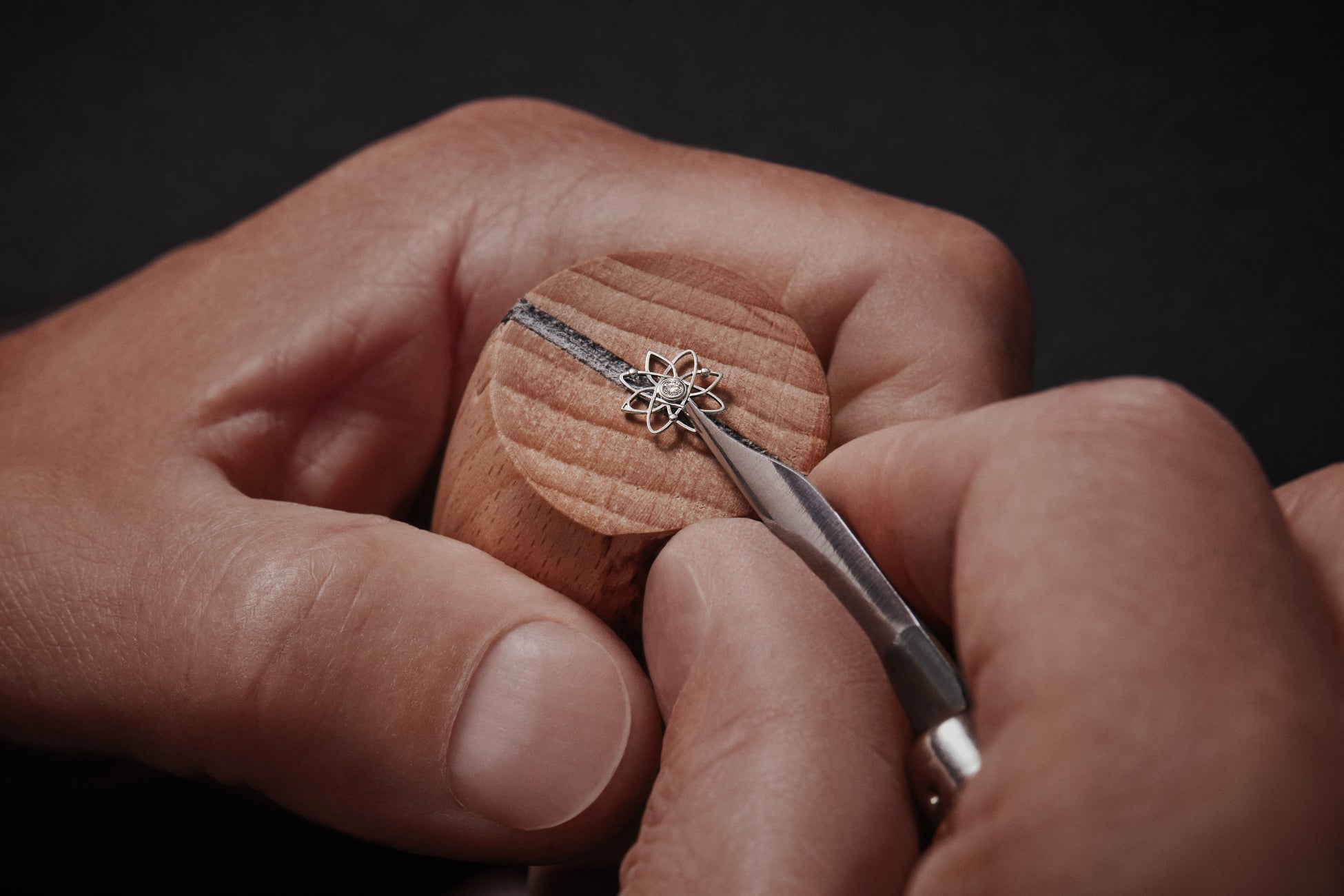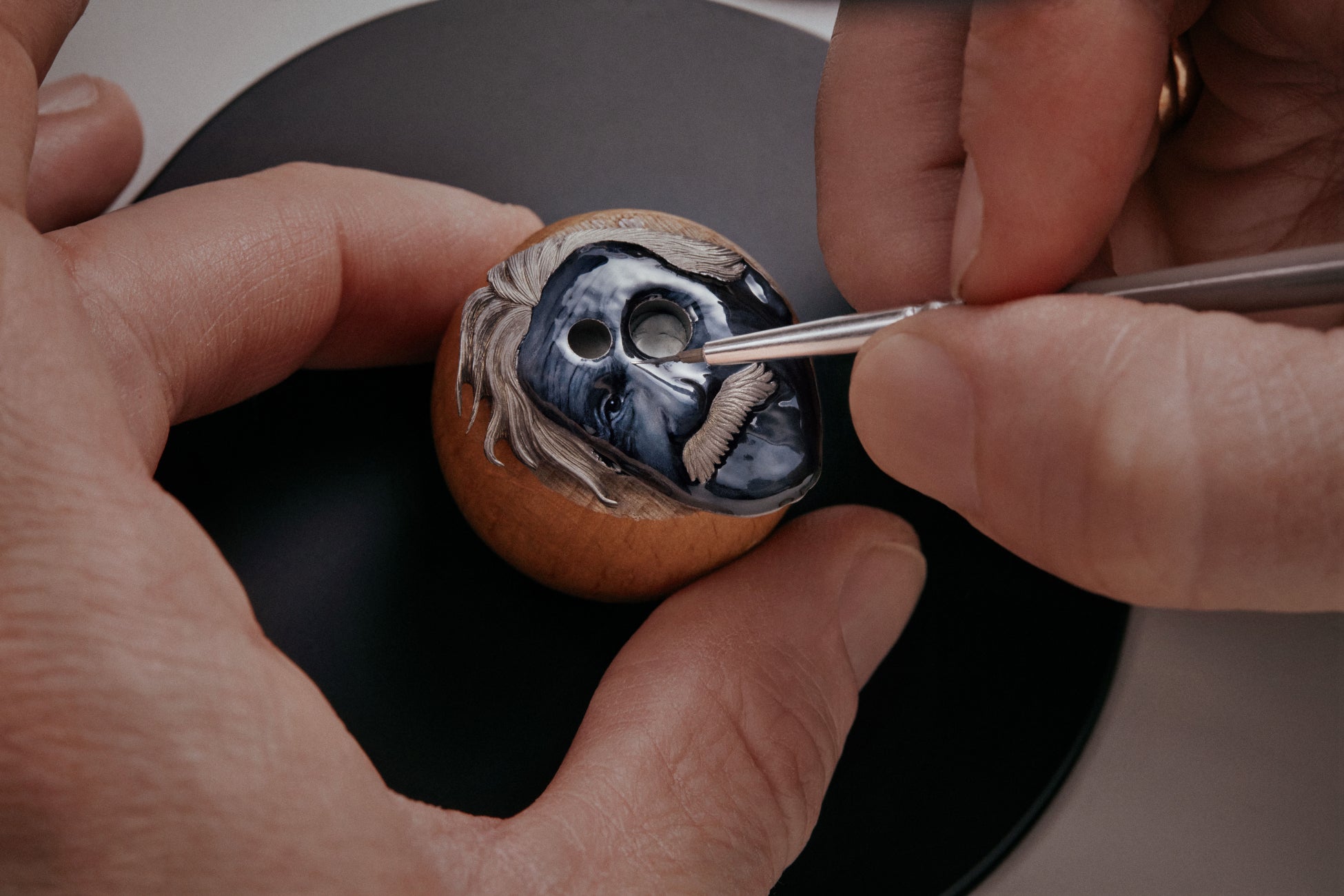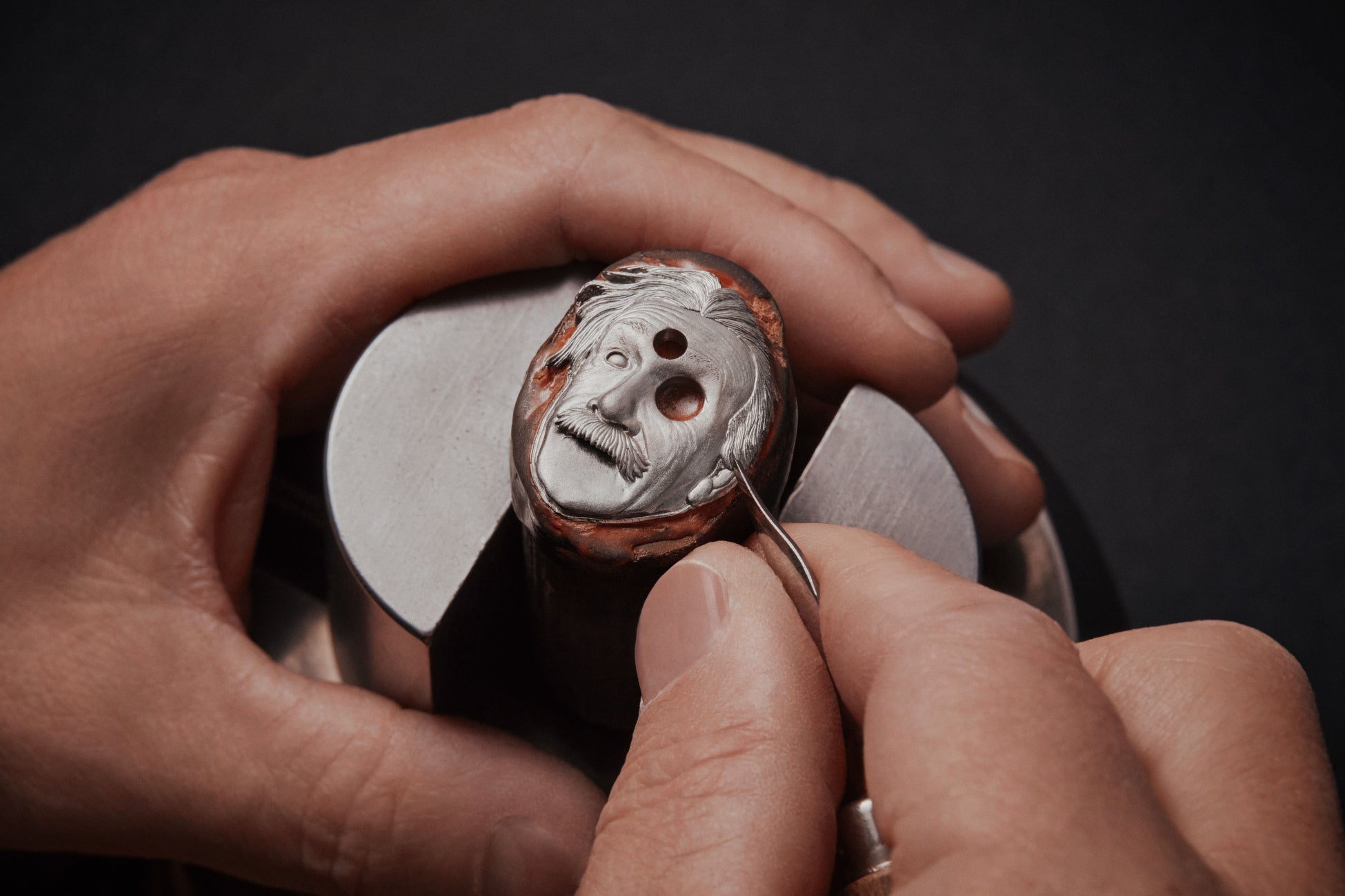 メゾンの職人の並外れた仕事ぶりは、「タンブール アインシュタイン オートマタ」に見て取れます。世界で最も著名な科学者の顔を再現するという仕事は、アトリエの彫金師ディック・ スティーンマンに委ねられました。ディックの立体彫刻の才能は、この工芸の枠を越えて、微細彫刻にまで及んでいます。平面の写真画像を、立体的で生き写しのホワイトゴールド製のアインシュタインの肖像に生まれ変わらせるために合計80時間の作業時間が費やされ、驚異的に高いレベルで再現されています。ディックは額や、目の周り、口の脇のしわを丹念に彫り上げました。アインシュタインの髪や口髭は、一房 一房、見分けることができます。スティールはゴールドよりもずっと硬いので、このスティール製ウォッチケースの一部やオートマタのプッシュボタンを成す髪の房を彫るのに、ディックはさらに40時間を費やしました。