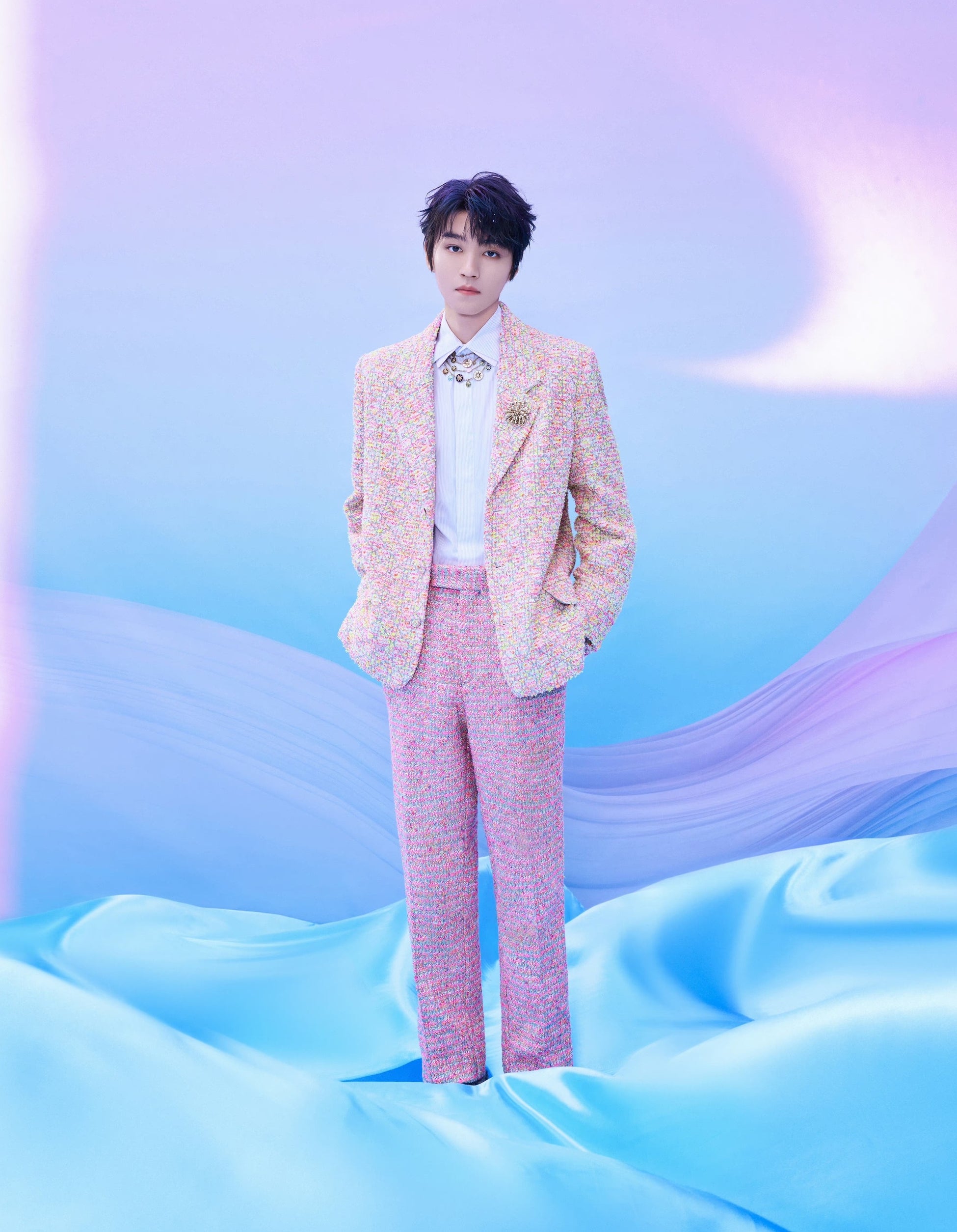 8月6日に北京で開催された、TFBOYSの10年記念コンサート。メンバーのワン・ジュンカイは、キム・ジョーンズによる2024年サマー メンズ コレクションより、マルチカラーコットンツイードのノッチラペルジャケットにブルーストライプのシャツとウールツイードのパンツを合わせ、ディオールのファイン ジュエリーより、「ローズ デ ヴァン」のネックレスを纏い登場しました。