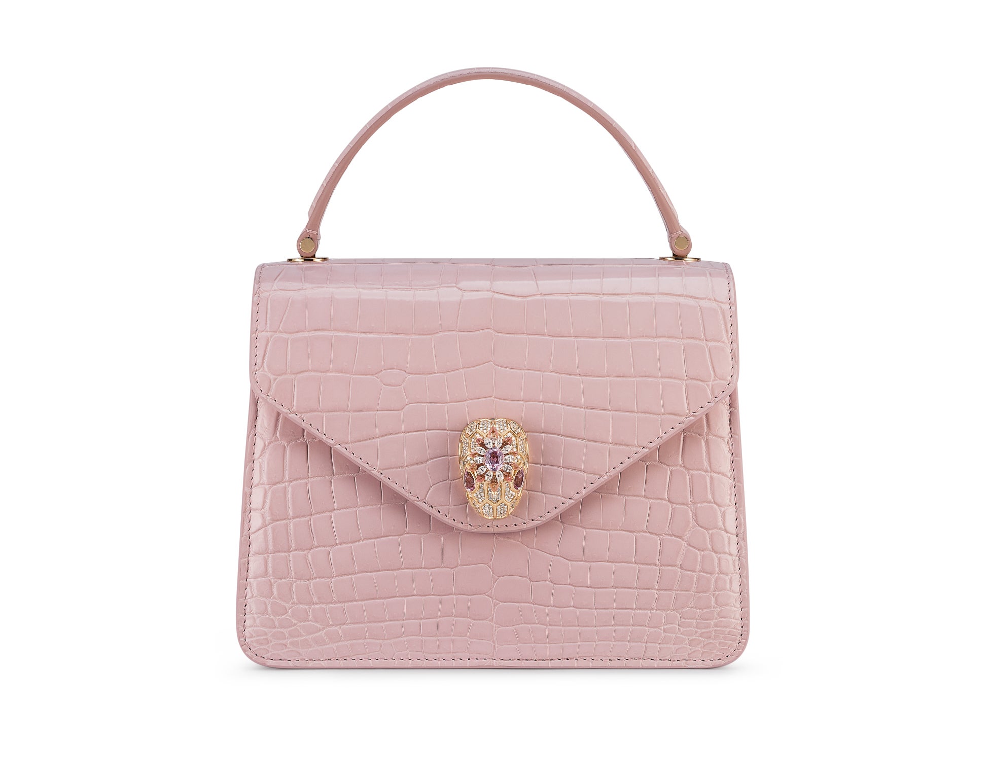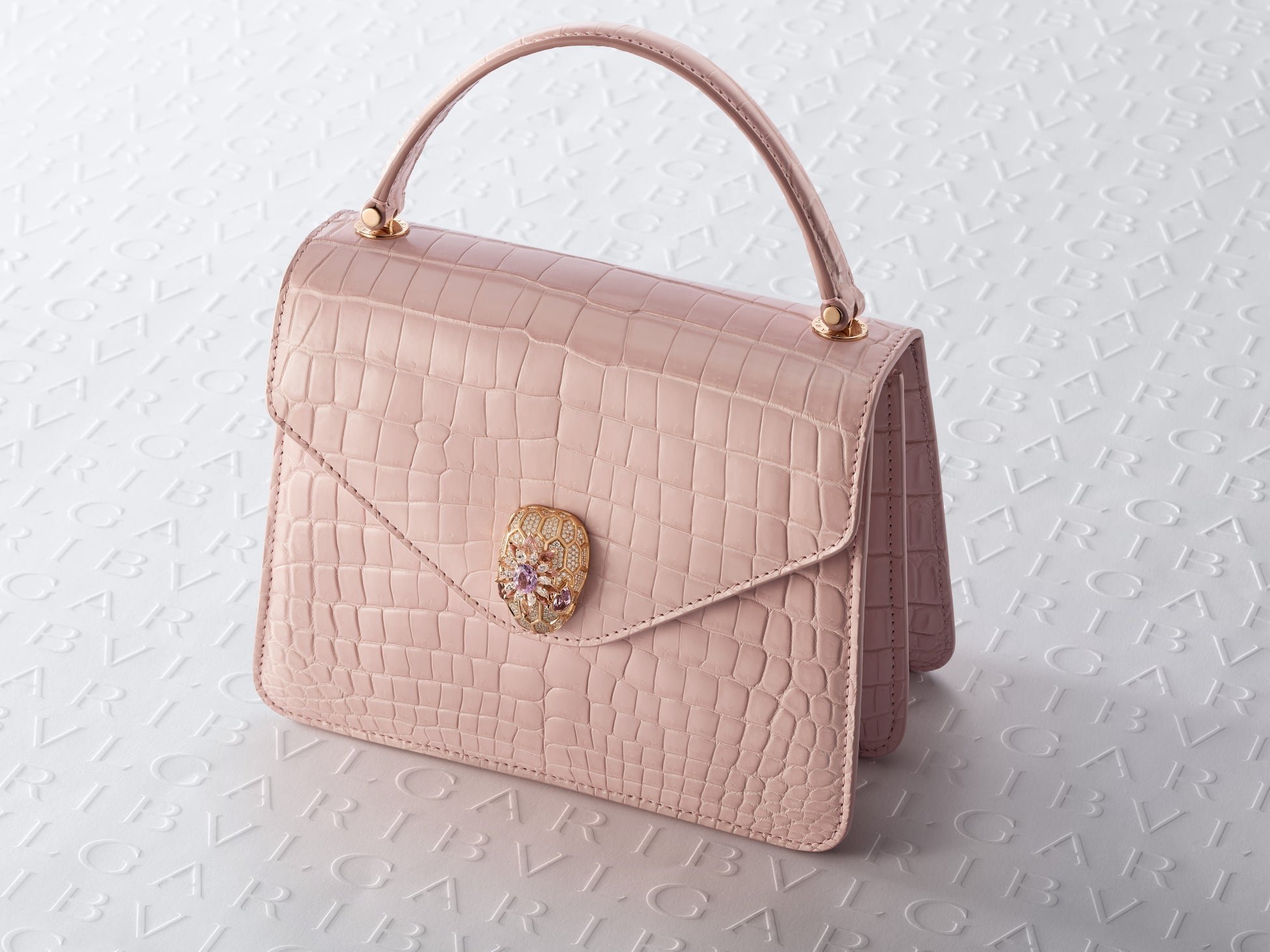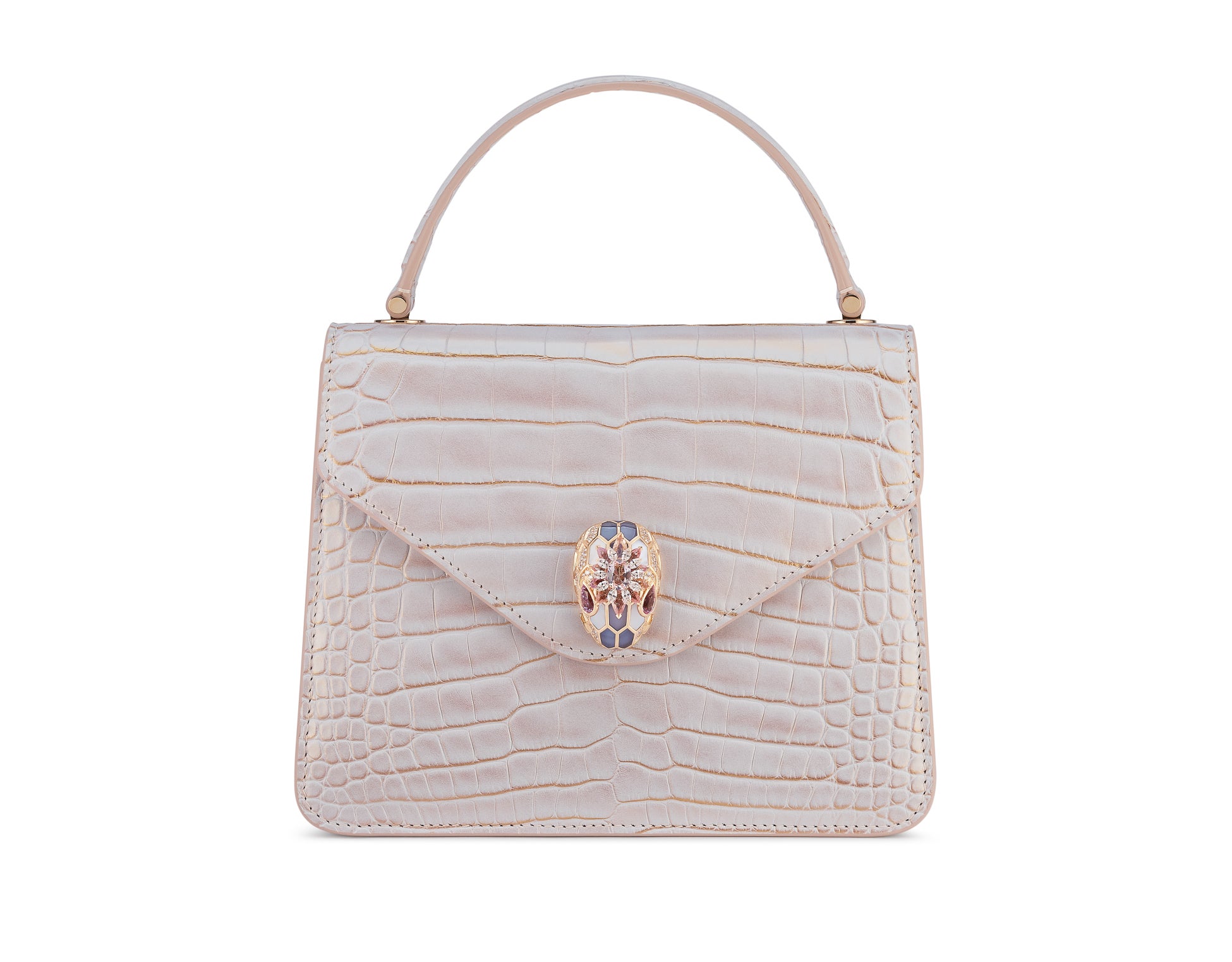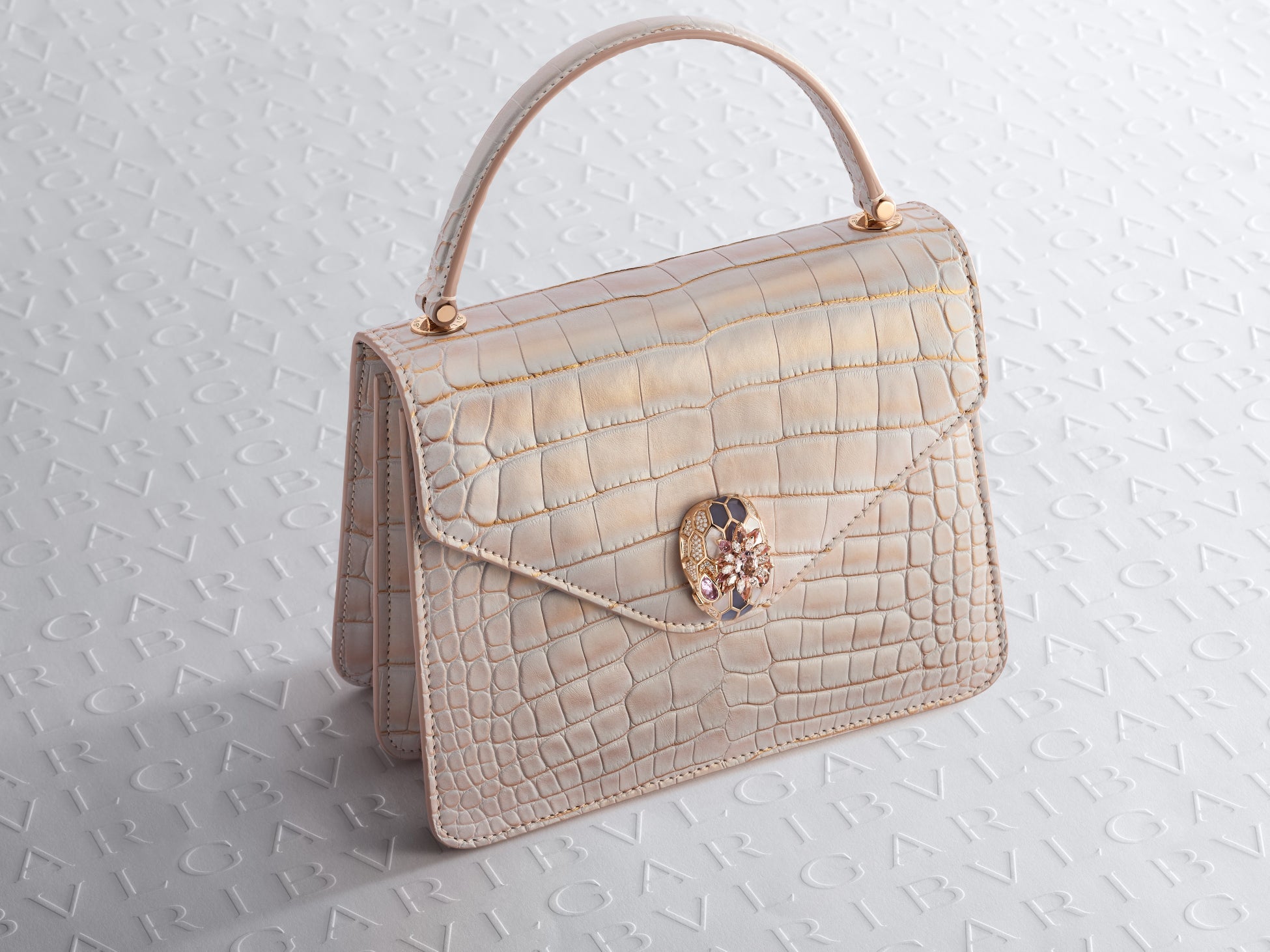 2つ目のクリエイションはムーンパールカラーのアリゲータースキンを用いたもので、ブルガリの熟練の職人がフィレンツェのアトリエで、この貴重な素材につややかに輝く淡い虹色のカラーをプラスしています。ローズゴールドを用いたお揃いのスネークヘッド クロージャーは、クリソプレーズ、カルセドニー、ダイヤモンドで彩られたうろこの上に、オーバルカットを施した3.5カラットのモルガナイトがあしらわれ、その周りをダイヤモンド、モルガナイト、クンツァイトの花びらが縁取っています。