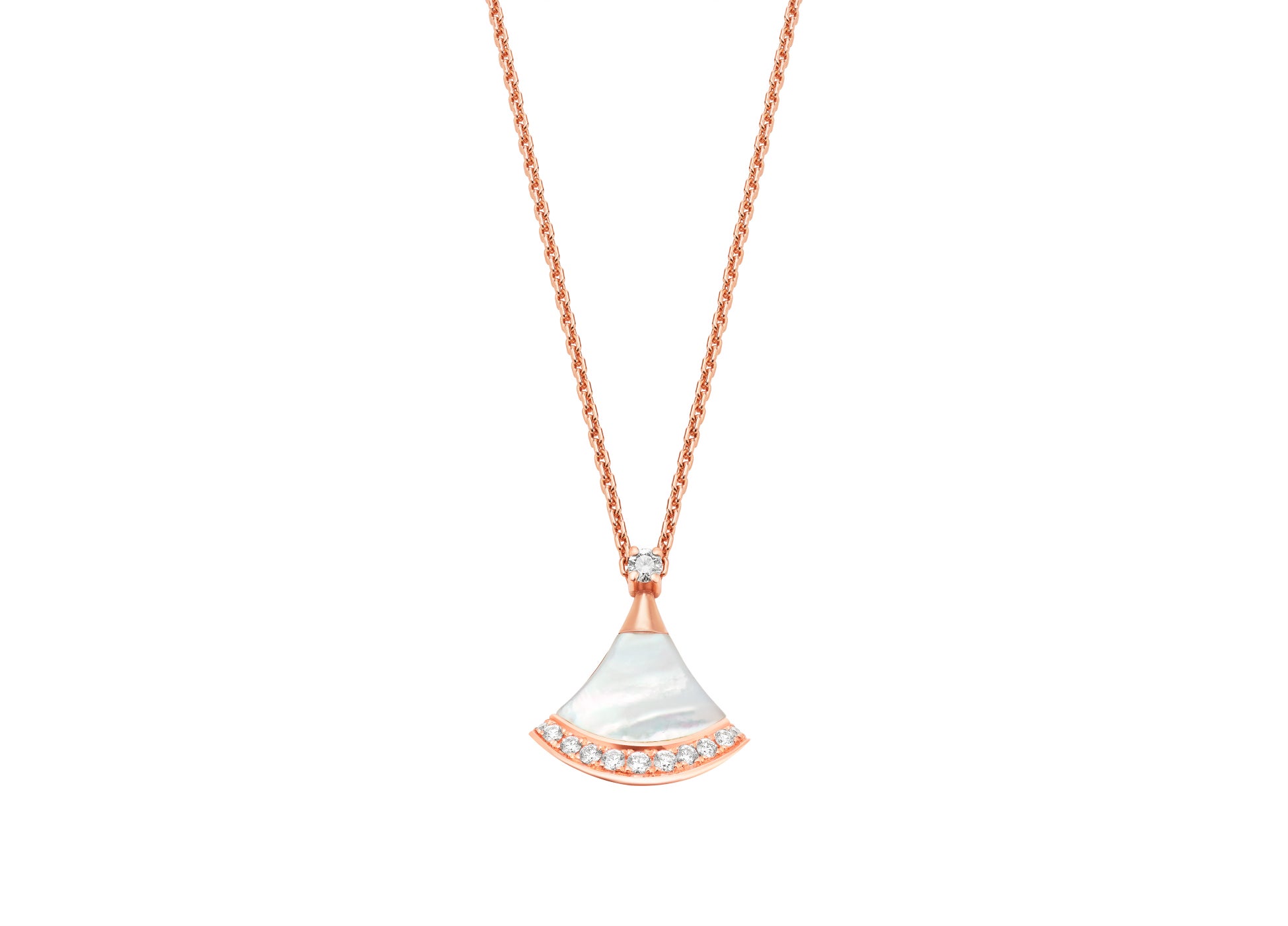 アイコニックな扇形モチーフ ローマのクリエイティブなヘリテージに深く根ざしたオープンワークの扇型のモチーフが喜びに満ちた輝きを放つコレクション。マザーオブパールとダイヤモンドが美しいネックレスにはブルガリの無限の想像力と職人の卓越した技術が込められています。モダンでエレガントなこのピースは多彩な表情を持ち、様々なシーンにマッチします。