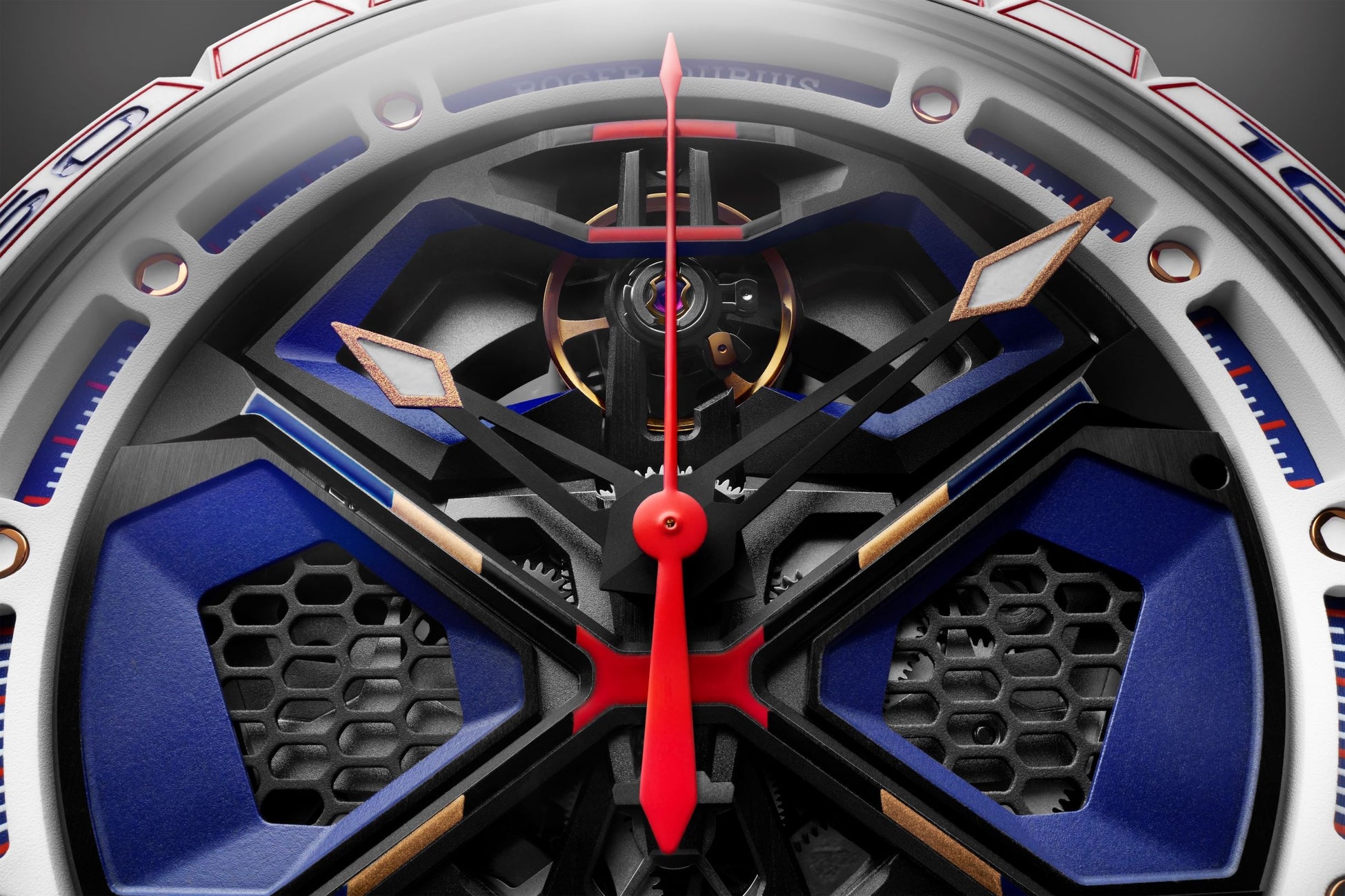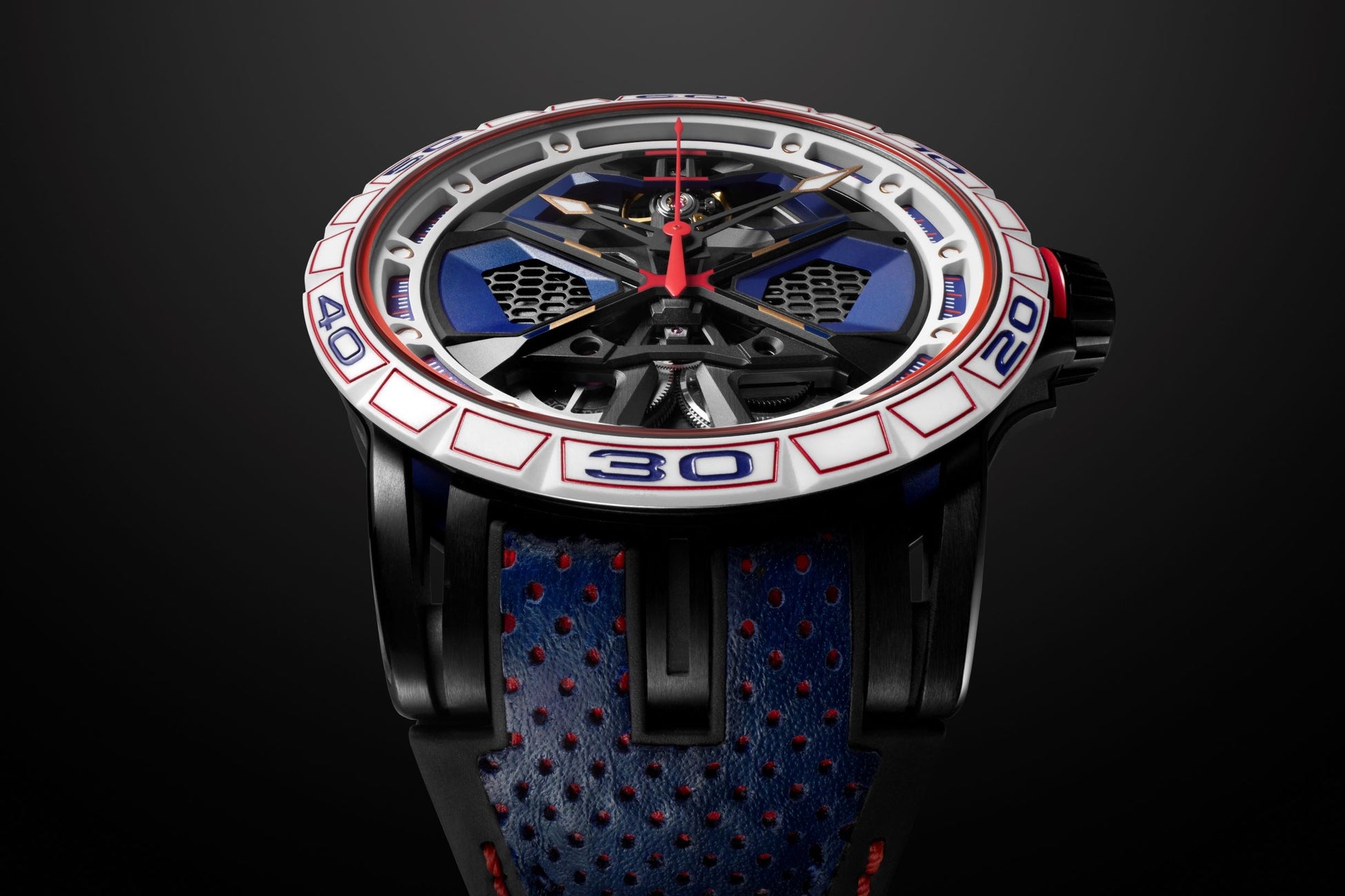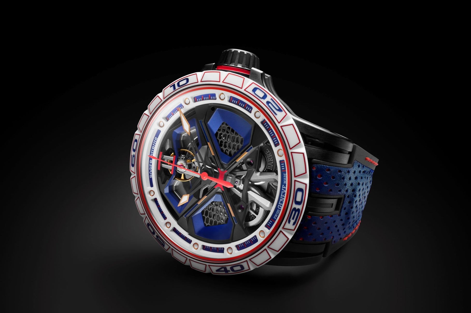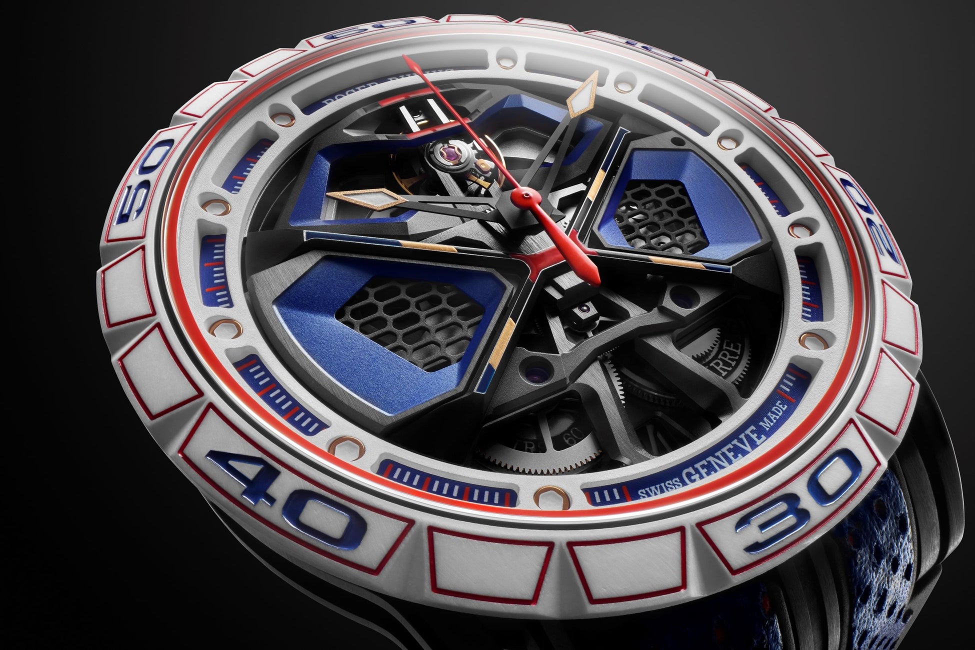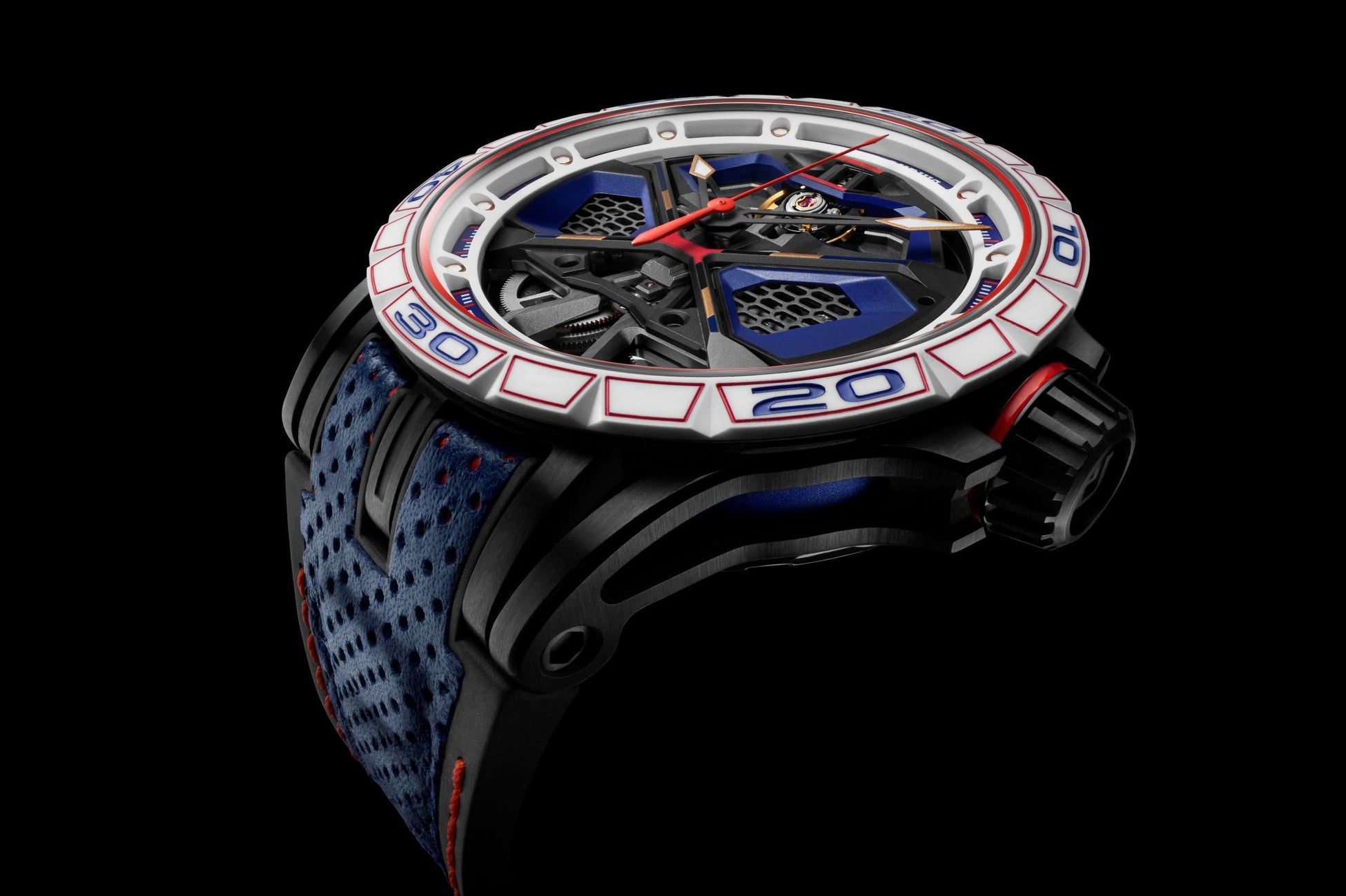 唸るエンジン、地響きのようにパワフルな振動。スピードとともに湧き出るアドレナリン。長きにわたり、スタートからゴールまですべての瞬間を震えるようなスリルで満たしてきたスーパーカーレース。スポーツ界で最も伝説的なカラーリングが時を超え、ロジェ・デュブイのアイコニックなスタイルを体現する時計として生まれ変わります。 新たに登場する エクスカリバー スパイダー HuracanMB は、ロジェ・デュブイとランボルギーニ スクアドラ コルセとの長きにわたるパートナーシップからインスピレーションを受けた、アイコニックなレーシングカラーにオマージュを捧げるレッド、ホワイト、ブルーのフュージョンカラーが特徴です。