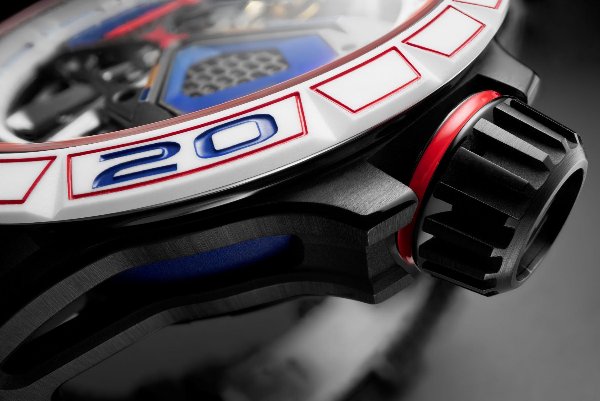 ケースを縁取るホワイトベゼルは、ミネラルコンポジットファイバー(MCF)と呼ばれるカーボンよりも13%、セラミックよりも2.5倍軽い超ハイテク素材を使用しています。 さらにリューズでもスーパーカーからのインスピレーションを表明。ランボルギーニ ウラカンのホイールナットを再現したかのようなシェイプに、レッドカラーのレーシングストライプと一連のウィングレットで、圧倒的なビジュアルインパクトと最適なグリップ性を提供しています。 そしてケースバックのサファイアクリスタルにブラックスタンプで施されたExcalibur Huracanのロゴが、この完璧なタイムピースをさらに特別な一本に仕上げています。