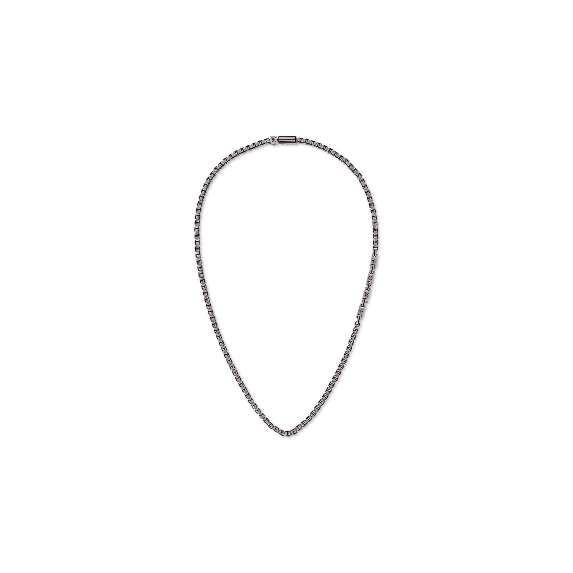 「ネックレス・LV テーラー」は、クラシカルなシルバーカラーにアンティーク調の加工を施し、モダンな印象に仕上げています。一部のリンクには、メゾンの象徴であるモノグラム・フラワーまたはLV イニシャルがブラックのパティーナで刻印され、繊細なラインが施されたリンクがそれらをつないでいます。バークラスプで開閉するスタイルです。