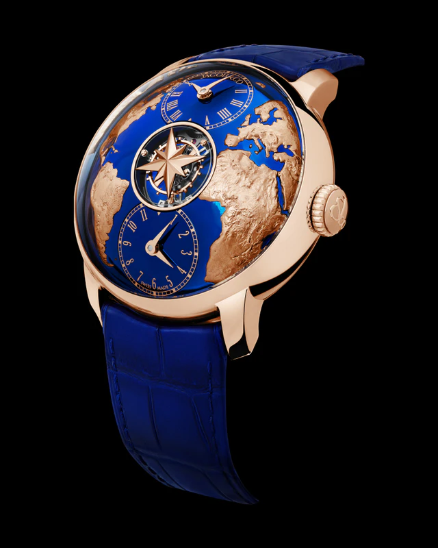 2023年モデルではアーチ状に立体的なフォルムを描いた文字盤が印象的でしたが、今回発表された新作では、その造形美がさらに深化しました。手のひらに地球儀を乗せているかのような感覚を与える、地球を想起させる球体的フォルムがより強調されています。ケース全体で“地球”を表現するというコンセプトは変わらず貫かれており、文字盤にはローズゴールド仕上げの繊細な刻印が施され、ケースバックでは、メタライゼーション加工によって大陸が美しく描かれています。