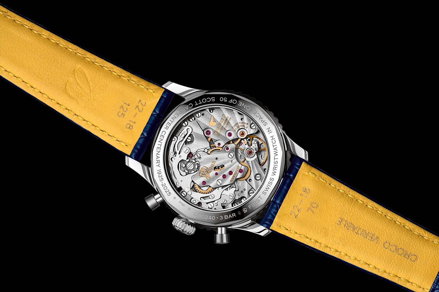 COSC(スイス公式クロノメーター検定機関)の認定を受けたこのムーブメントは、約70時間のパワーリザーブを備えており、その美しい構造をサファイアクリスタル製のケースバック越しに鑑賞できます。ムーブメントのブリッジ部分には、スコット・カーペンターの偉業を讃える「Carpenter」「Aurora 7」「3 orbits around the Earth」「Mercury 7」といった刻印が精緻に施されています。さらにケースバックにも、「First Swiss wristwatch in space」「One of 50」「Scott Carpenter Centenary 1925-2025」という記念文字が刻まれ、特別な意味を宿しています。