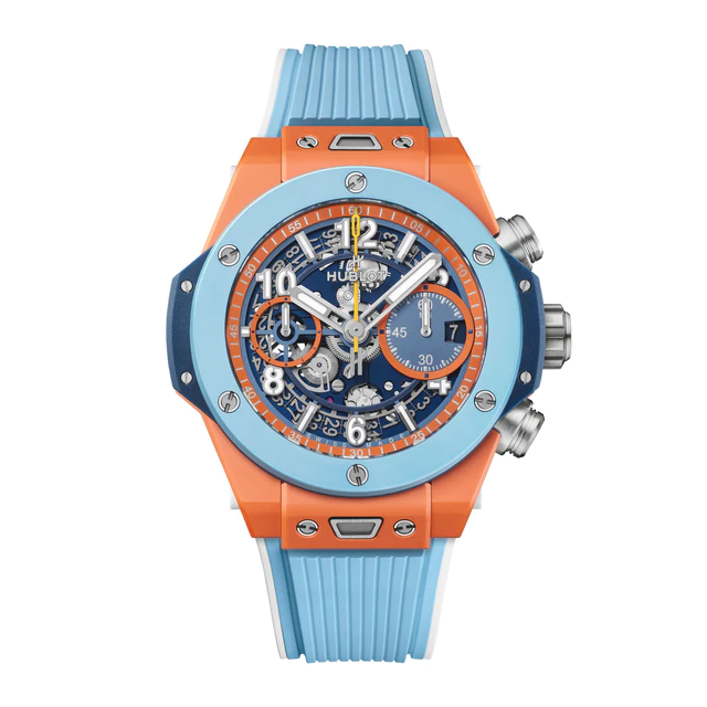 ウブロがその象徴的コレクションである「ビッグ・バン ウニコ」から、新たなサマーエディション「ビッグ・バン ウニコ サマー 2025」を発表しました。本作では、ブランドの代名詞ともいえるハイテクセラミックをケース素材に採用し、マイクロブラスト加工を施したオレンジセラミックが、まるで沈みゆく太陽の光を想起させるような輝きを放ちます。さらに、ベゼルに用いられたスカイブルーのカラーは、広大な海の情景を映し出すような深みを持ち、全体に鮮やかなコントラストを演出します。軽快でありながらも洗練されたデザインが特徴のこのモデルは、陽光と波がきらめく夏のシーンにふさわしい一本です。