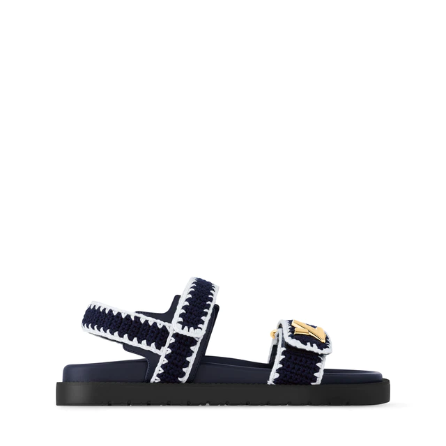 今季登場した「LV サンセット サンダル」は、ツートンカラーのコットンクロシェを用いて、繊細な手仕事のような雰囲気に仕上げられました。足元にリラックス感を添える2本のベルクロストラップのうち、1本にはゴールドカラーのLV ツイストアクセサリーが施されています。快適な履き心地を実現するために、パッド入りのアナトミックフットベッドと軽量ラバーのアウトソールを採用しています。