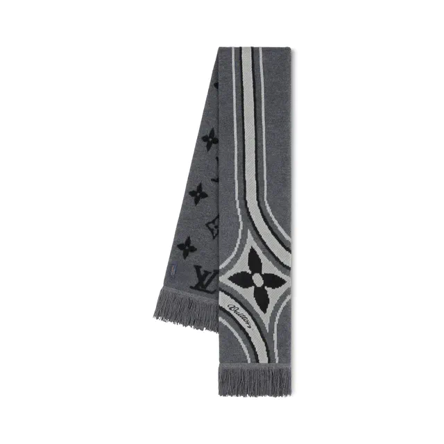 「マフラー・グラフィック フラワー」は、シックなグレーにブラック&ホワイトの曲線とモノグラム・フラワーをあしらった上品なデザインが特徴です。内側には手書き風の「Vuitton」シグネチャーを控えめに配置し、細部にまで洗練を感じさせます。柔らかく暖かなウール混紡素材とたっぷりとしたフリンジが、冬の装いに優雅なニュアンスを加えています。