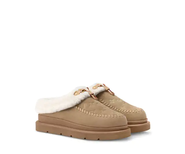 「コルティナ ミュール」は、モノグラム・パターンをデボス加工であしらったスエードレザーを使用し、内側には暖かく心地よいシアリングを施しています。LV サークルのシグネチャーを配したレザーシューレースがアクセントに。軽やかな履き心地とエレガントなフォルムが特徴で、ウィンターリゾートはもちろん、都会でのデイリースタイルにも自然に馴染むデザインです。