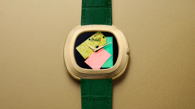 その上には、ナミビア産イエローサーペンティン、ピンクオパール、グリーンクリソプレーズが薄くスライスされて配置されています。これらの色彩は、ウォーホルのポラロイド作品を想起させる明快なトーンでありながら、ピアジェ特有のエレガンスを損なわないバランスを保っています。段差をつけた45mmの18Kイエローゴールド製ケースに収められ、深みのあるグリーンレザーストラップが全体を引き締めます。ケースバックには縦方向のサテン仕上げが施され、ジュエリーのような輝きと時計としての堅牢さが共存しています。