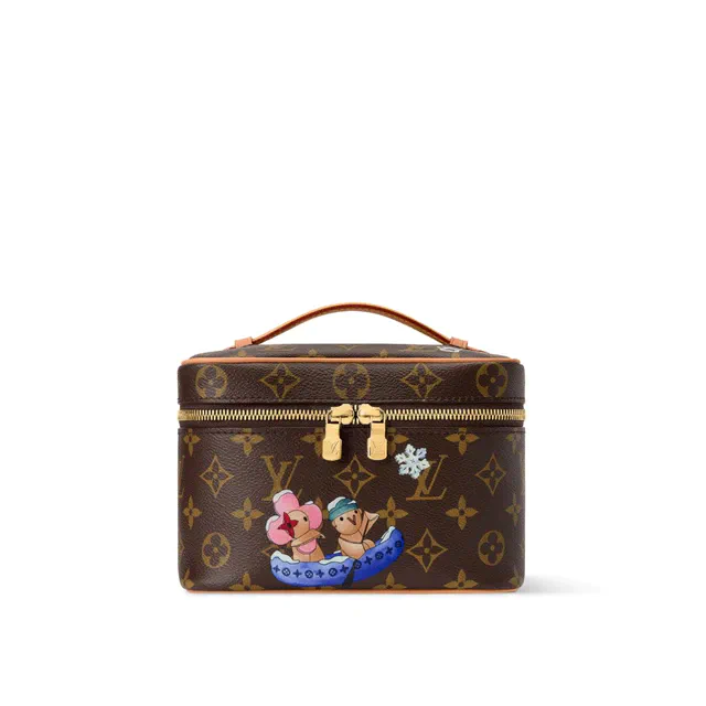 同じくモノグラム・キャンバスを用いた「トリオ・ポッシュ・トワレ」は、3つのポーチをセットにした機能的なアイテム。列車や自転車で旅を楽しんだり、熱気球に乗って冬の動物たちと出会ったりと、ヴィヴィエンヌが織りなす冒険の物語が鮮やかに描かれています。内側には水拭きできる明るいブルーのテキスタイルを施し、コスメやデイリーグッズをスタイリッシュに収納できるデザインです。冬の旅を連想させるユーモアと実用性が見事に調和しています。