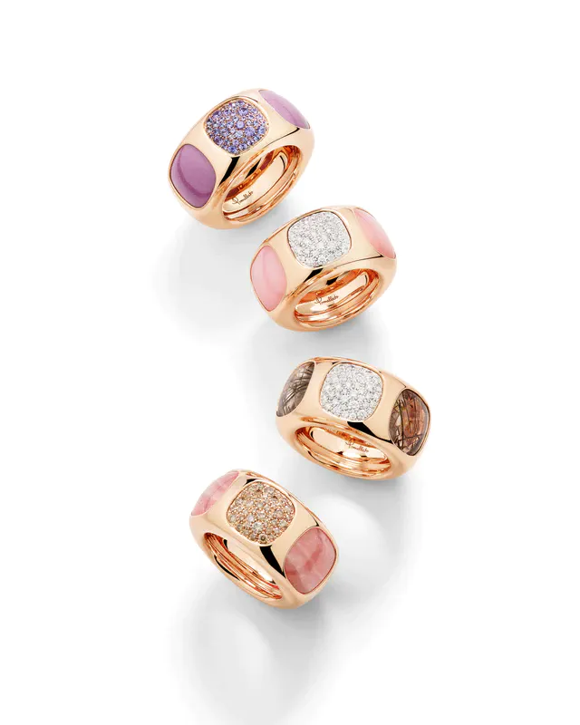 このコレクションの中心にあるのは、ポメラートを象徴するカボションカットの技術です。丸みを帯びたドーム型のフォルムは、メゾンが掲げる「洗練された大胆さ」を体現しています。さらに、クッションスクエア型のカットでは、ストーンが本来持つ色合いや模様が際立ち、古典的な造形美を現代的な感性へと優雅に昇華させます。光の流れが石の表面をやわらかくすべり、重量感やバランス、肌への馴染み方までも計算された仕上がりです。視覚的なボリュームと繊細な着け心地を両立させた構築美が、メゾンの技術力を物語っています。